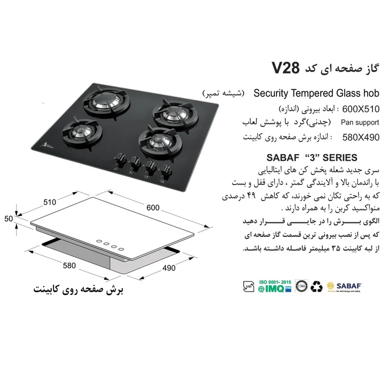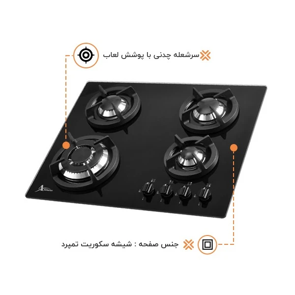 – سایز اجاق گاز: طول: 60 سانتی متر عرض: 51 سانتی متر – تعداد شعله : 4 شعله – نمای ظاهری: شیشه مشکی – جنس صفحه : شیشه – جنس شبکه: چدن – جنس ولوم: باکالیت – شعله پلوپز: دارد – جرقه زن اتوماتیک: دارد – ترموکوبل تاپ تایم: دارد – قطعات اصلی: ولوم ، جرقه زن ، ترموکوبل ، سرشعله SABAF سری 3 ساخت ایتالیا