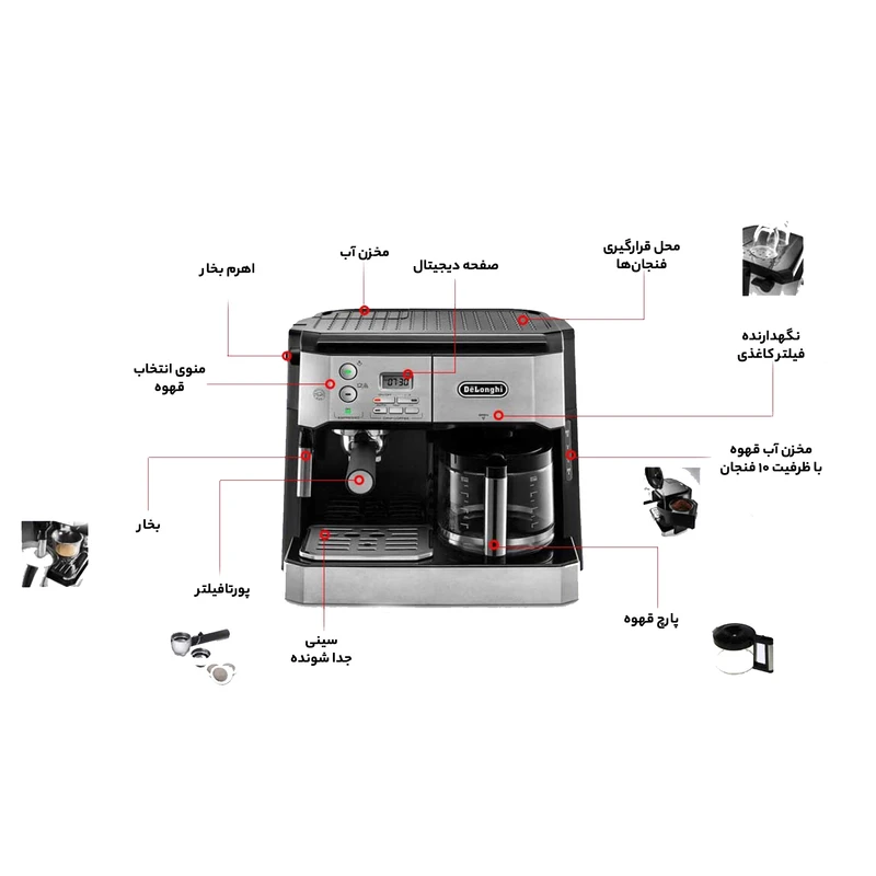 امکان بازشدن قسمت نگه دارنده‌ فیلتر برای تمیزکاری آسان، امکان تهیه‌ 10 فنجان قهوه‌ فرانسه، امکان تهیه‌ همزمان قهوه‌ اسپرسو و فرانسه (دو مخزن جداگانه)، دارای فیلتر دائمی قهوه، سینی چکه گیر