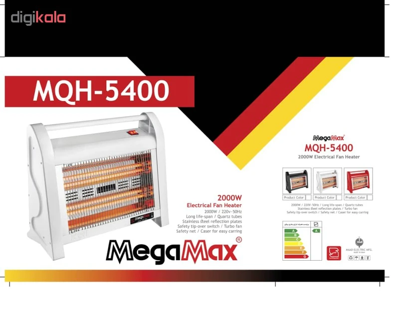 بخاری برقی مگامکس مدل 5400 حدودا ۲.۵ کیلوگرم وزن دارد و ۳۸۰ در ۱۹۰ در ۵۵۰ میلی متر، ابعاد آن را تشکیل میدهند. این بخاری ۴ المنت دارد که با کمک دکمههای تعبیه شده در بالای بدنه بخاری میتوانید حرارت آن را تنظیم کنید و با توجه به دمای محیط، المنتها را روشن کنید. ساختار بدنه بخاری کاملا یکپارچه است و در بالا، دستهی آن را میبینید که به بدنه چسبیده و پایههای چسبیده به آن نیز تضمین میکنند که بخاری روی زمین ثابت میماند و احتمال واژگون شدن آن بسیار کم است. این بخاری از حداکثر توان گرمایشی ۲۰۰۰ وات بهره میبرد. بنابراین در فصلهای سرد خیلی زود محیط را به گرمایی دلچسب و مطلوب میرساند. رده مصرف انرژی بخاری برقی مگامکس 5400 برابر با A است. پس با خیال راحت میتوانید از آن استفاده کنید و نگران افزایش مبلغ قبض برق خود نباشید.