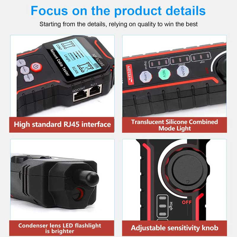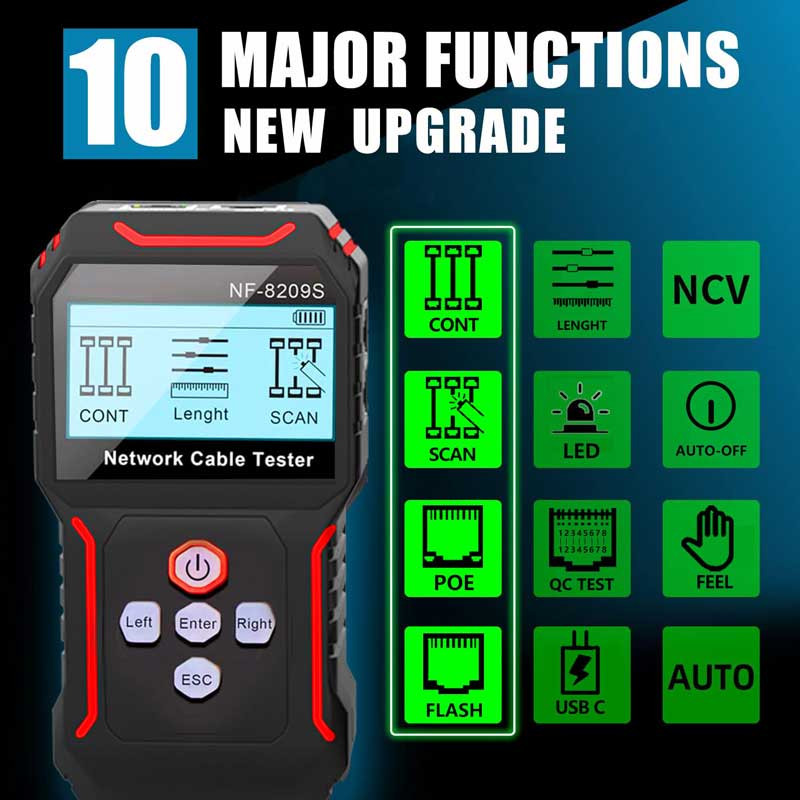 عملیات محصول 1. CONT– باز، کوتاه، متقاطع، و غیره را برای STP، کابل UTP تست کنید. 2. طول – اندازه گیری طول کابل شبکه، محدوده 2.5 متر ~ 200 متر است. 3. اسکن — آنالوگ / دیجیتال / حالت PoE برای تعیین محل کابل های شبکه. 4. PoE– برای سوئیچ PoE استاندارد یا غیر استاندارد (60 ولت) موجود است، استاندارد AT یا AF از نوع PSE را شناسایی کنید. 5. فلاش – پورت شبکه را با چراغ چشمک زن در سوئیچ/روتر پیدا کنید.