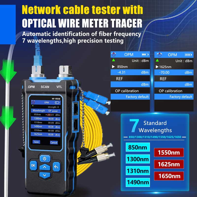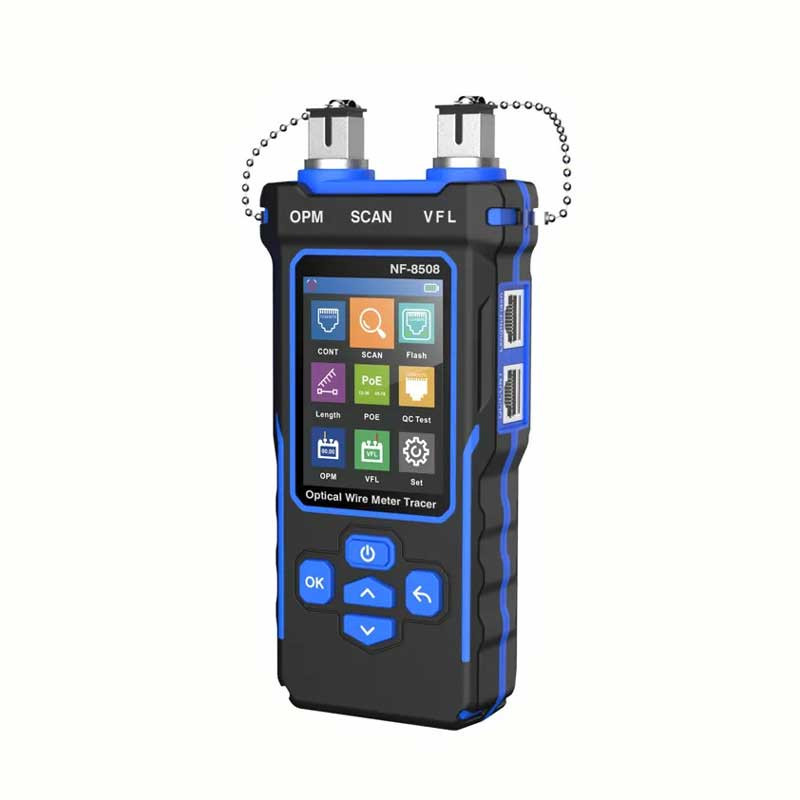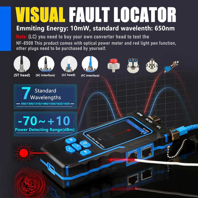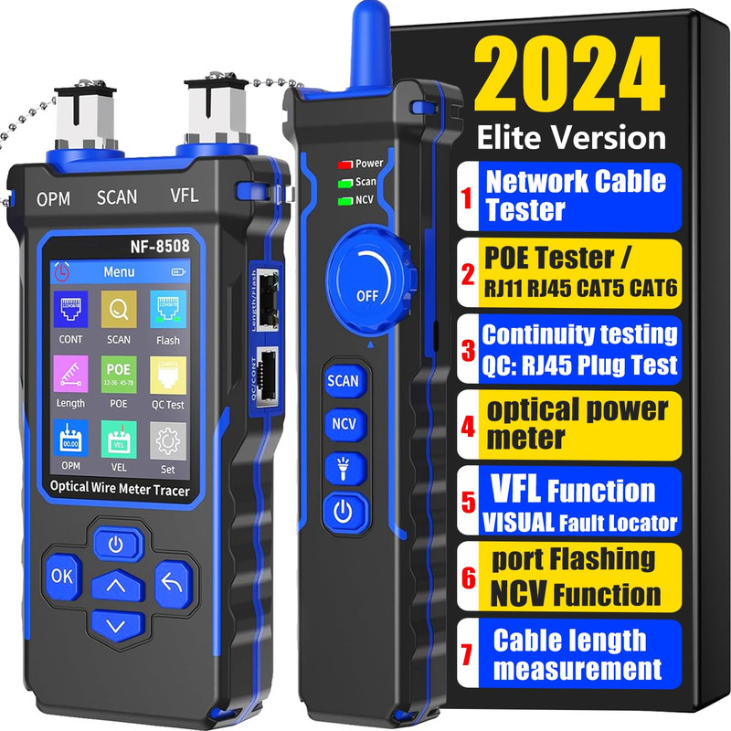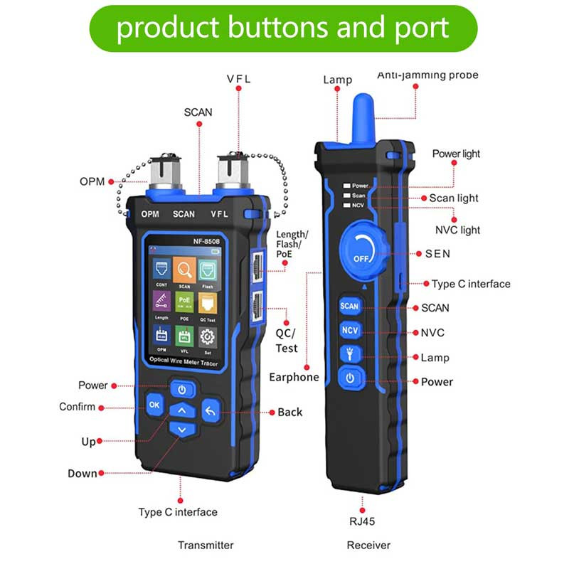 1. Testing open circuit, short, cross, and split pair for RJ45 cable. 2. Two scan modes select-able: Normal Mode/ Anti-jamming Mode. (The sensitivity can be adjusted.) 3. Port Blink Function: For locating network port by the flashing port light on Hub/Switch. 4. Measure CAT5, CAT6 cable length accurately , the range is 2.5m~200m. 5. POE Function: It can test the information of standard POE device, such as POE voltage, power supply polarity, power supply mode and also the type of PSE (af or at standard). 6. QC Testing for Crystal Head: Plug and unplug the cable that needs to be tested, and the results are updated automatically. A tick indicates that the channel is normal, and a cross indicates that the channel is . 7. Optical Power Meter Function: (1) Available Unit: dBm, dB, or mw, uw, nw (2) Available Wavelength: 850nm, 1300nm, 1310nm, 1490nm, 1550nm, 1625nm. 8. Red Light Pen Function: Can switch three modes : Fast flash, Slow flash and always bright. 9. NCV Function: The NCV indicator lights green, means NCV function turns on. 10. Set Function: Set up Language/backlight/ backlight time/ auto-off time/system information(version No.) etc. 11. Lighting Function, convenient to work in dark environment. 12. Headphone Function: Easy to use in noisy environments or long distance line-hunting. 13. Rechargeable Lithium battery for long-time work. Adjustable auto-off time.