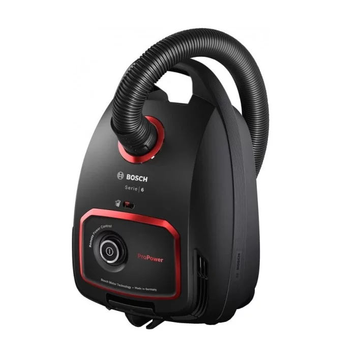 جارو برقی بوش از سری 6 محصولات بوش، مجهز به موتور کمپرسور با مصرف برق 850 وات و مکشی معادل جارو های 2200 وات موتور معمولی (جاروهای نسل قدیم)، کنترل مکش و خاموش و روشن بر روی دسته دستگاه میباشد،سیستم کنترل روی دسته بصورت بلوتوث با باتری (بدون سیم)، پاکت یکبار مصرف قابل تعویض با گنجایش 4 لیتر، دارای 3 عدد پارویی مجزا شامل :فرش و موکت، پارویی مجزا جدید (Pro Power) جهت سنگ و سرامیک دارای برس گردان در سطح کفی که براحتی مو و زباله های ریز را از سطوح مختلف جمع میکند (مناسب حیوانات خانگی)، پارویی مجزا مخصوص سطوح پارکت، طول سیم 12 متر، بدنه ضد خش، ساخت کشور آلمان