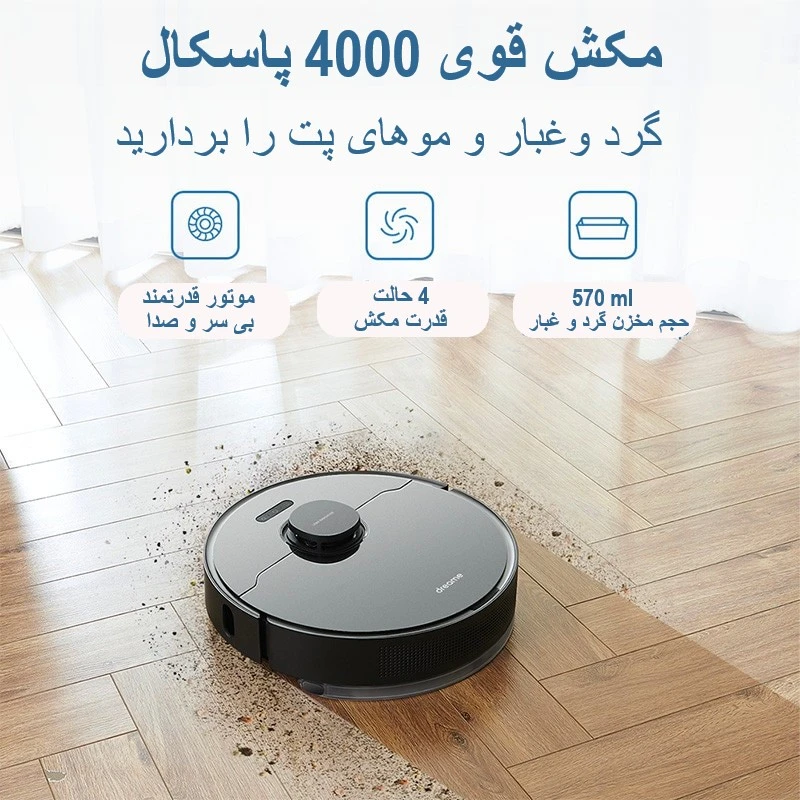 شعاع عملکرد 250 متر مربع، قابلیت چرخش 360 درجه ای، حساسیت 65 دسی بل، دارای 3 چرخ، شارژ خودکار، مجهز به فیلتر قابل شستشو