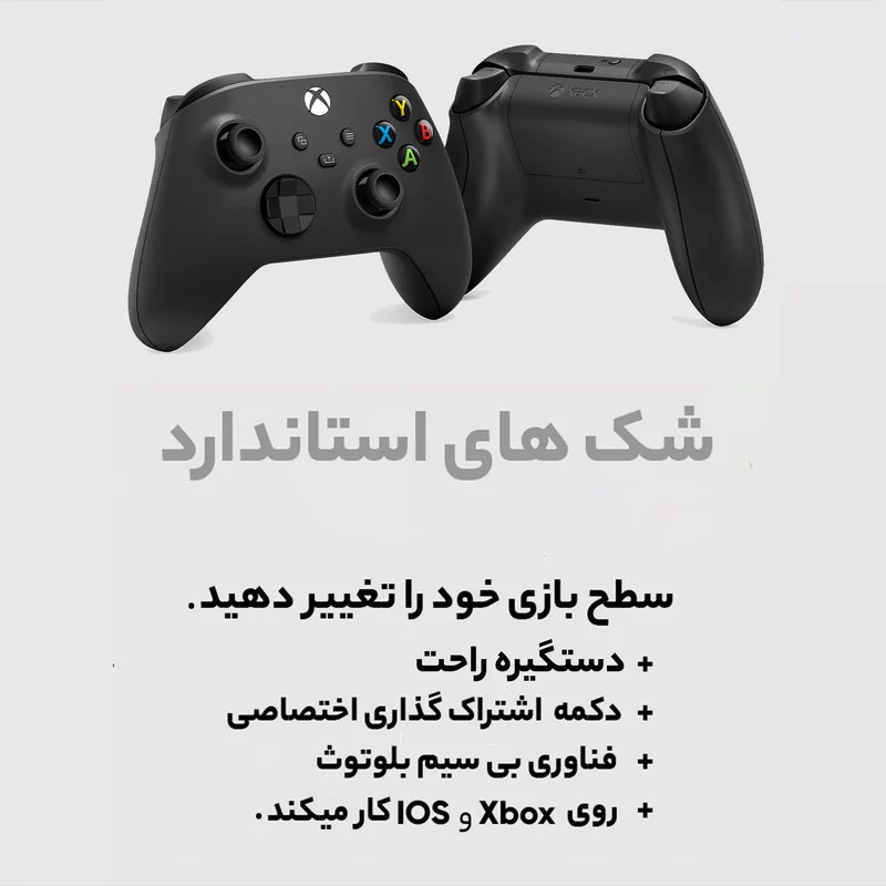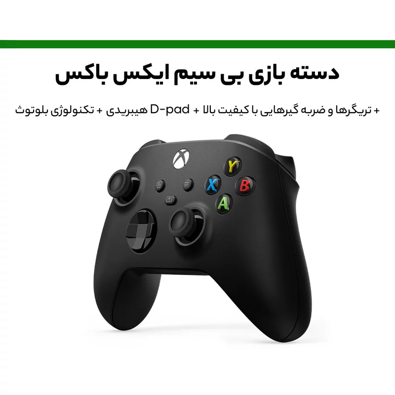 امکانات ارتباطی: اتصال بی سیم - USB C باتری: نیازمند دو باتری قلمی یا باتری قابل شارژ (مجزا خریداری شود) سال ساخت: 2020 محدوده استفاده بیسیم: 9 متر نسخه ی کپی خور شده: خیر نوع: کنترلر بی سیم خانواده محصول: Xbox تاریخ عرضه: 20 آبان 1399 رنگ: Carbon Black نشانگر LED: دارد وزن: 444gr اقلام همراه: دو عدد باتری قلمی دوراسل تریگرها: دو دکمه LT و RT حساس به فشار و دارای فیدبک خروجی صدا: جک 3.5 میلیمتری برای هدست دکمههای حرفهای: ندارد سایر ویژگیها: دارای دکمه Sync - دارای دکمه Share برای اشتراک گذاری - دارای پورت مخصوص شارژر فیدبک: ندارد ماژولها: ندارد میکروفون: ندارد نرم افزار: ندارد نوع اتصال: بلوتوث - کابل USB-C پلتفرمهای سازگار: ایکس باکس وان - ایکس باکس سری ایکس/اس - ویندوز ۱۰ به بالا - گوشیهای هوشمند چینش آنالوگها: متناوب
