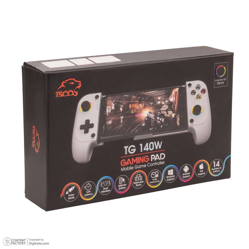 دارای نورپردازی RGB / باتری لیتیوم پلیمری با ظرفیت 600 میلی آمپر ساعت / عمر دکمه ها : 300000 بار و عمر میکرو سوییچ : 500000 بار / دارای کیف و کابل شارژ / میزان کارکرد 4 الی 6 ساعت / متریال داخلی دسته بازی : ABS و مگنت / میزان نیروی لازم برای فعال سازی کلید ها : 120 الی 200 گرم / دارای لایسنس MFI / سازگار با بازی کال آف دیوتی / کلید های R2 و L2 کلیکی / دارای پدهای سیلسکونی جهت عدم ایجاد خط و خش / ساپورت گوشی تا 7 اینچ