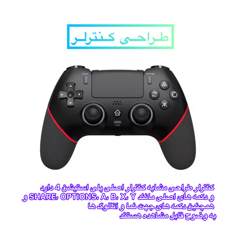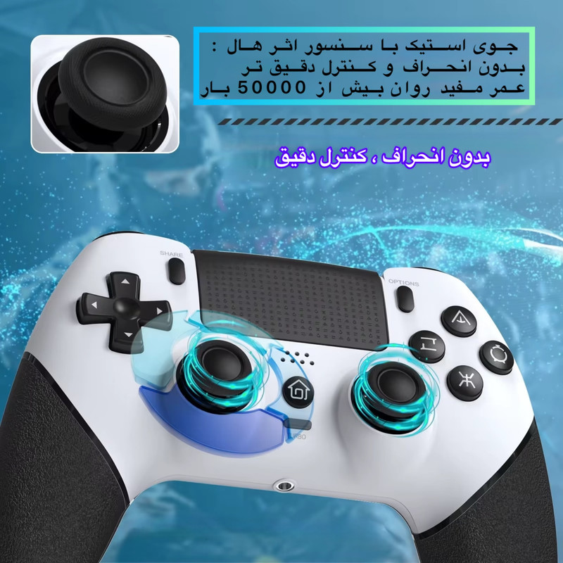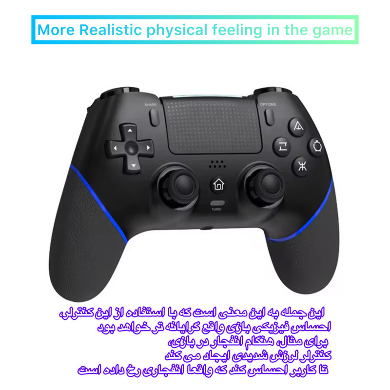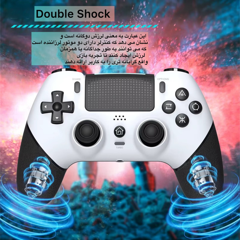 اتصال دوگانه (سیمی و بیسیم): امکان اتصال از طریق بلوتوث یا کابل USB برای انعطافپذیری در استفاده. • لرزش دوگانه (Double Shock): مجهز به دو موتور لرزشی مستقل که حس واقعیتری از حرکات و اتفاقات داخل بازی را به کاربر منتقل میکنند. • جویاستیک با سنسور اثر هال: دقت بالا و عمر مفید طولانی (بیش از 50,000 بار) بدون انحراف، برای کنترل دقیق در بازی. • نورپردازی LED: طراحی مدرن با چراغهای LED که ظاهر کنترلر را جذابتر کرده و وضعیت اتصال را نشان میدهد. • کلید Turbo: امکان تنظیم عملکرد سریع و تکرار خودکار برای دکمههای موردنظر، مناسب برای بازیهای اکشن و سریع. • طراحی ارگونومیک: طراحی راحت و متناسب با دست که از خستگی هنگام بازی طولانیمدت جلوگیری میکند. • سازگاری بالا: پشتیبانی از پلیاستیشن 4، رایانههای شخصی و برخی دستگاههای اندرویدی. • باتری داخلی قابل شارژ: امکان بازی بهصورت بیسیم با شارژدهی مناسب و شارژ سریع از طریق درگاه USB-C.
