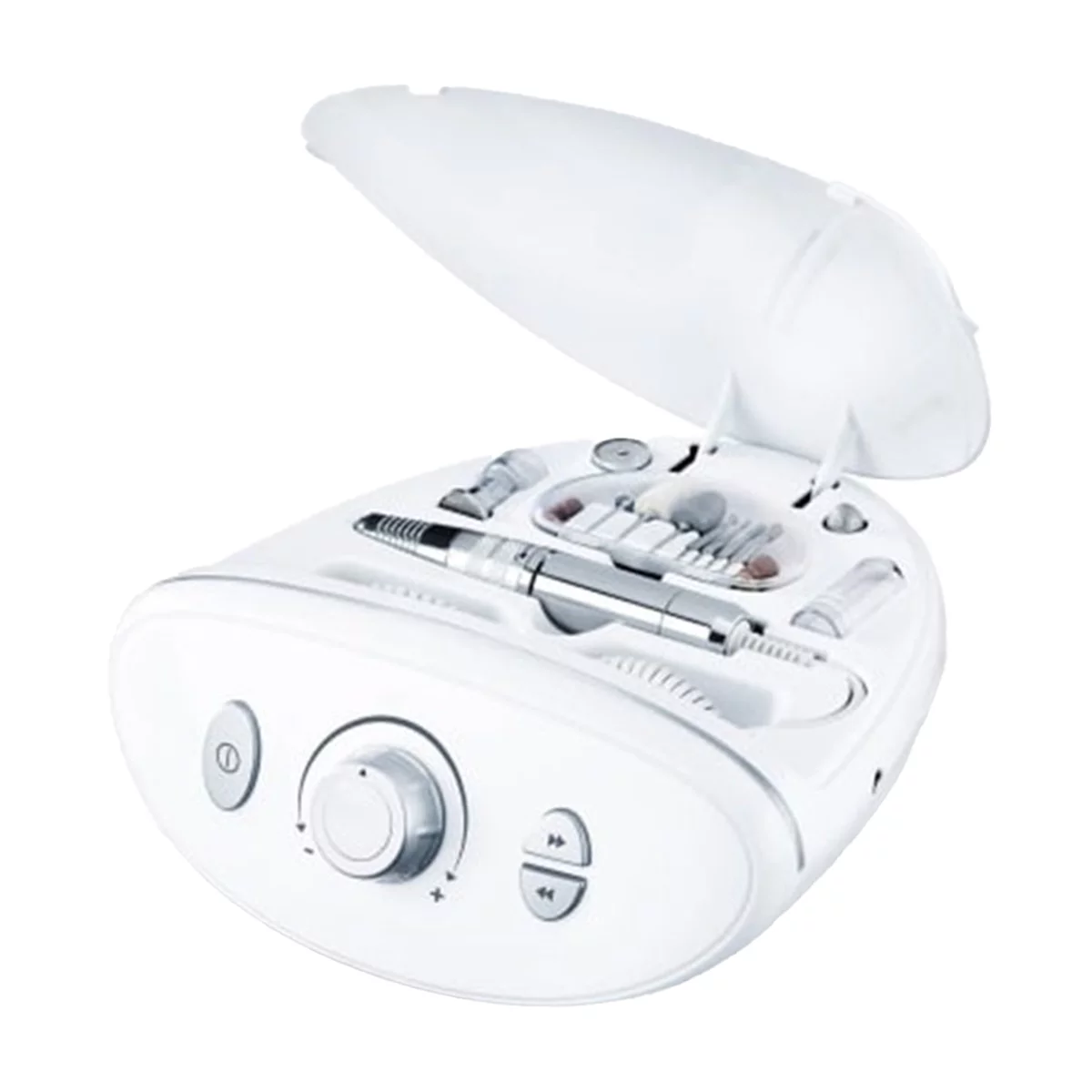 1 عدد ست مانیکو پدیکور، 1 عدد ابزار سوهانکاری، 1 عدد آداپتور برق، 10 قطعه جانبی با کیفیت، 1 محافظ گردگیر ناخن، 30 قطعه سنباده یکبار مصرف