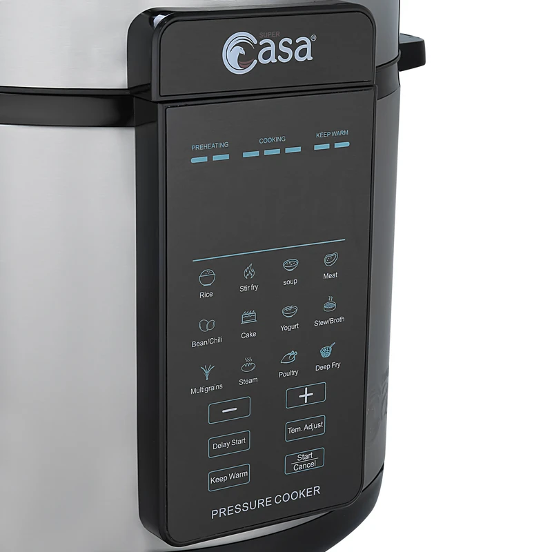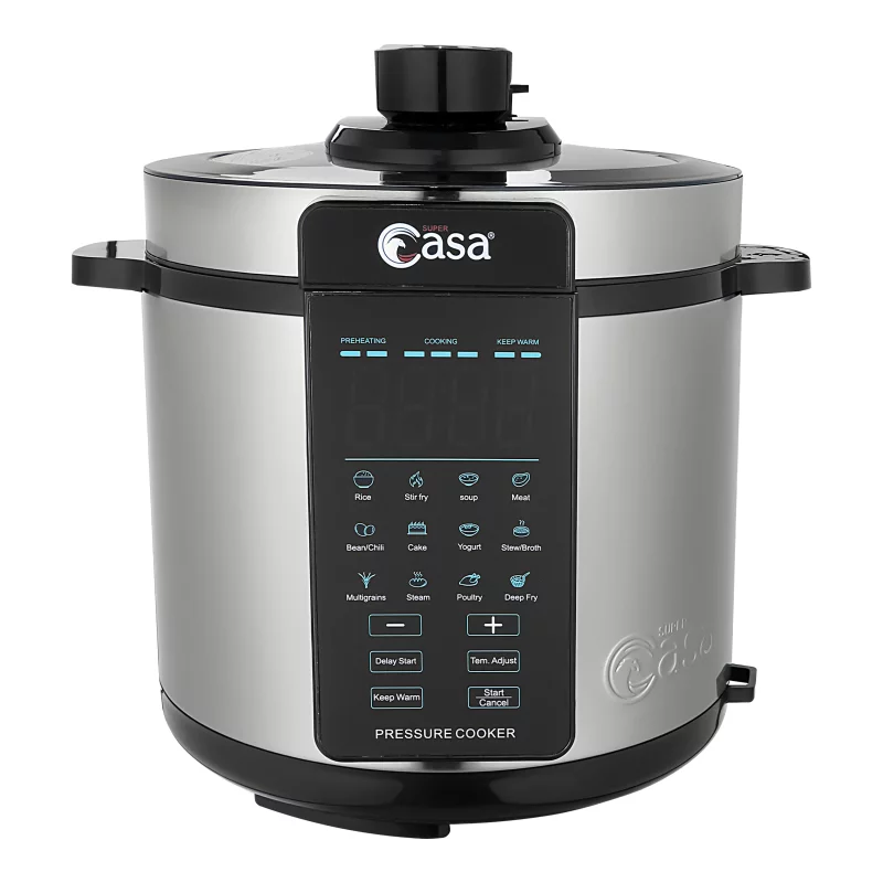 زودپز برقی سوپر کاسا، گنجایش ۶ لیتر، توان مصرفی ۱۰۰۰ وات، دارای ۱۲ برنامه پخت متنوع شامل: برنج، سرخ کن، سوپ، گوشت، حبوبات، کیک، ماست، خورش یا آبگوشت، پخت دانه ها (جو)، بخارپز، طیور(مرغ، اردک و…)، سرخ کن با روغن، قابلیت زمان دهی جهت شروع پخت با تاخیر، دارای درب پوش محافظ آلومینیومی که دیگر نگرانی بابت گرفته شدن سوپاپ نخواهید داشت و با خیال راحت میتوانید هر نوع مواد غذایی را پخت کنید، سیستم گرم نگه دارنده، دارای سبد سرخ کن، سبد استیل بخارپز، طراحی و مهندسی محصول در کشو انگلستان مونتاژ نهایی در کشور چین