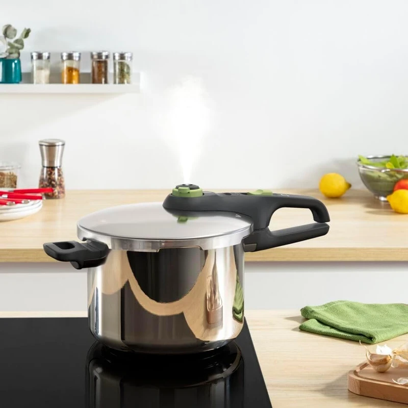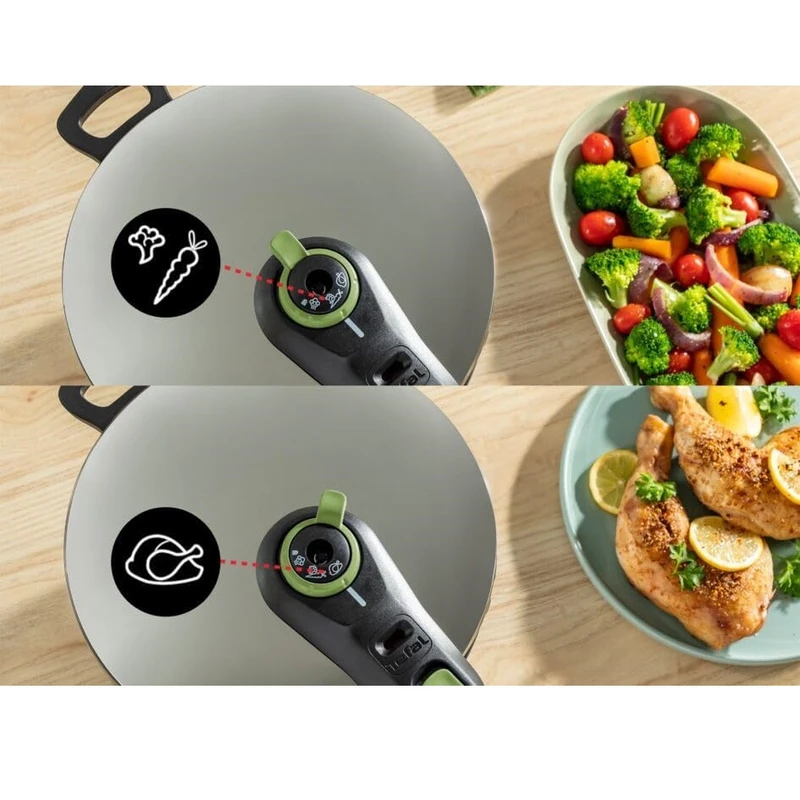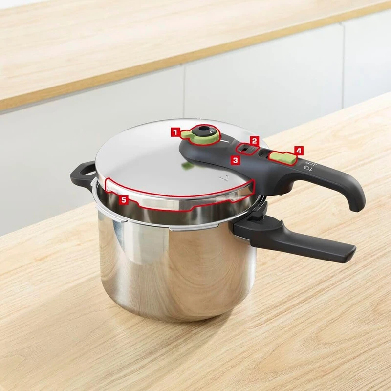 دو برنامه پخت و پز، دارای نشانگر فشار در صورت بسته نشدن صحیح درب مانع از پخت می شود، منفذ خروج خودکار هوا، باز و بسته کردن درب به صورت چرخشی و آسان، عملکرد پخت تا 2 برابر سریع تر از رقبا، 5 سیستم ایمنی ، همراه با سبد بخار