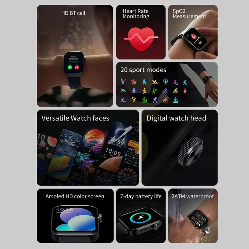 پشتیبانی از 20 حالت ورزشی، پایش ضربان قلب، اندازه گیری سطح اکسیژن خون، پایش وضعیت خواب، دارای میکروفون، قابلیت شخصی سازی واچ فیس، نمایش وضعیت آب و هوا، نمایش اعلان های گوشی و تقویم، نمایش روز و ساعت، تایمر، هشدار بیدارباش، کنترل موسیقی، پشتیبانی از 15 زبان مختلف