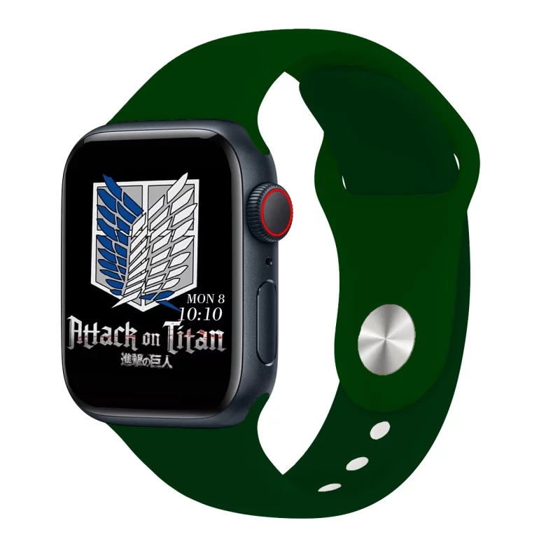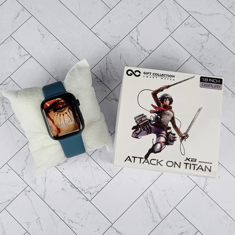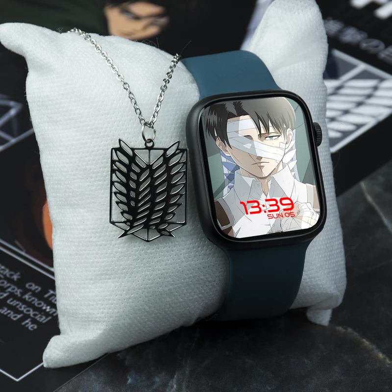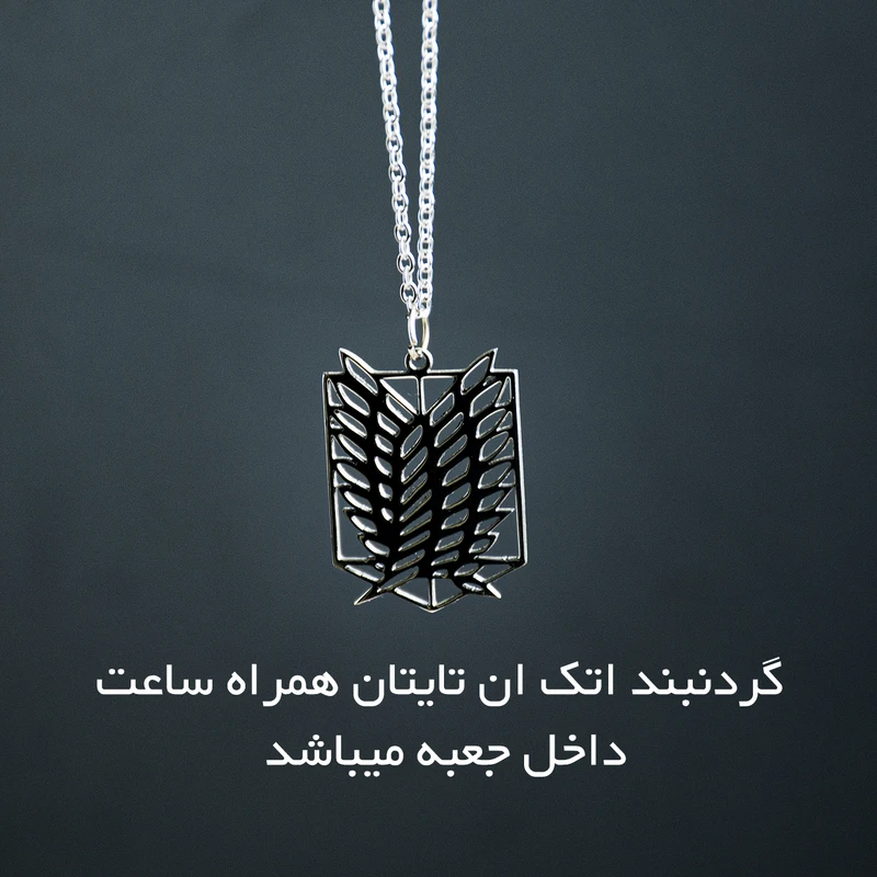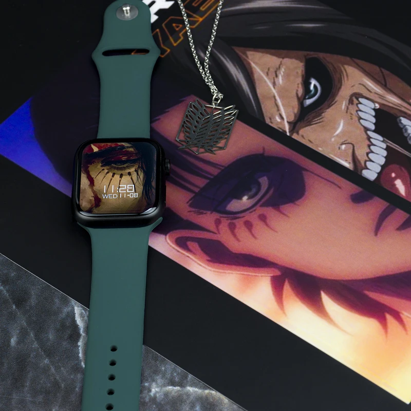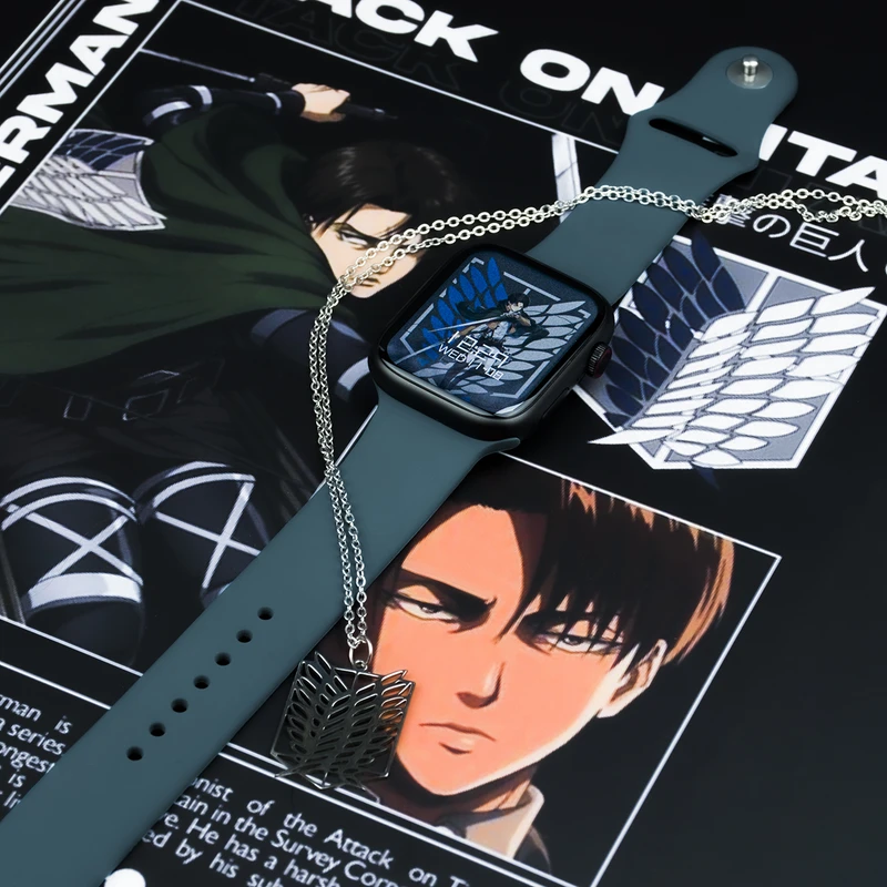 بدنه ساعت مشکی به همراه یک عدد بند سیلیکونی سبزآبی و یک عدد گردنبند اتک ان تایتان به صورت هدیه