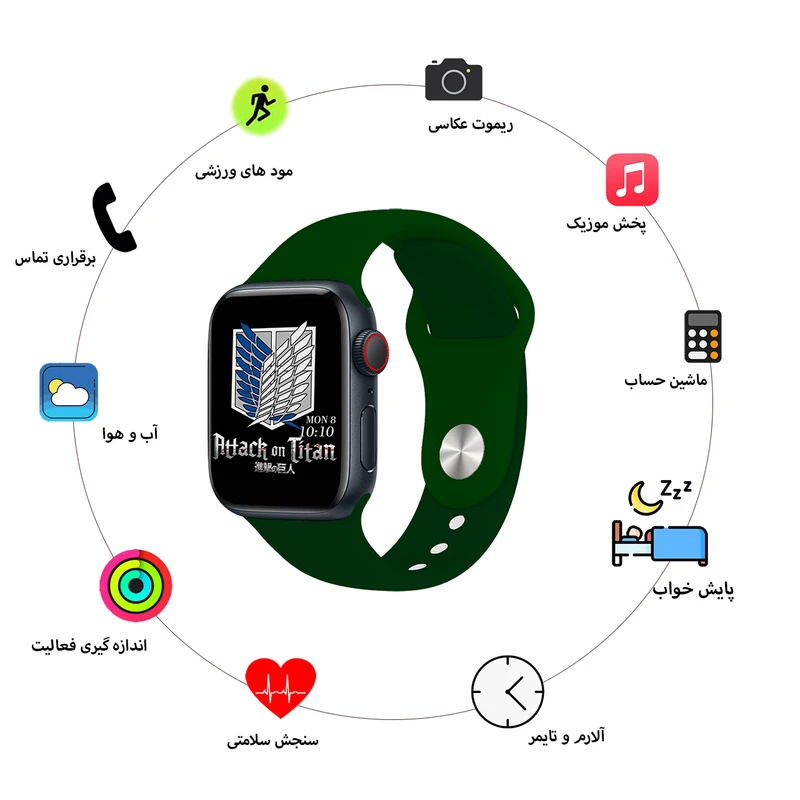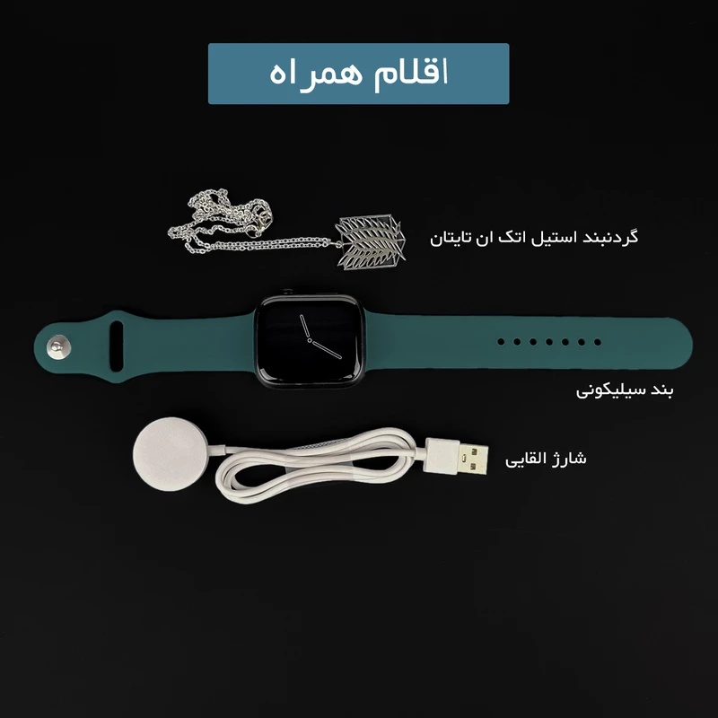 یک عدد بند سیلیکونی – یک عدد گردنبند اتک ان تایتان – شارژر ساعت هوشمند و راهنمای نصب نرم افزار به صورت فارسی