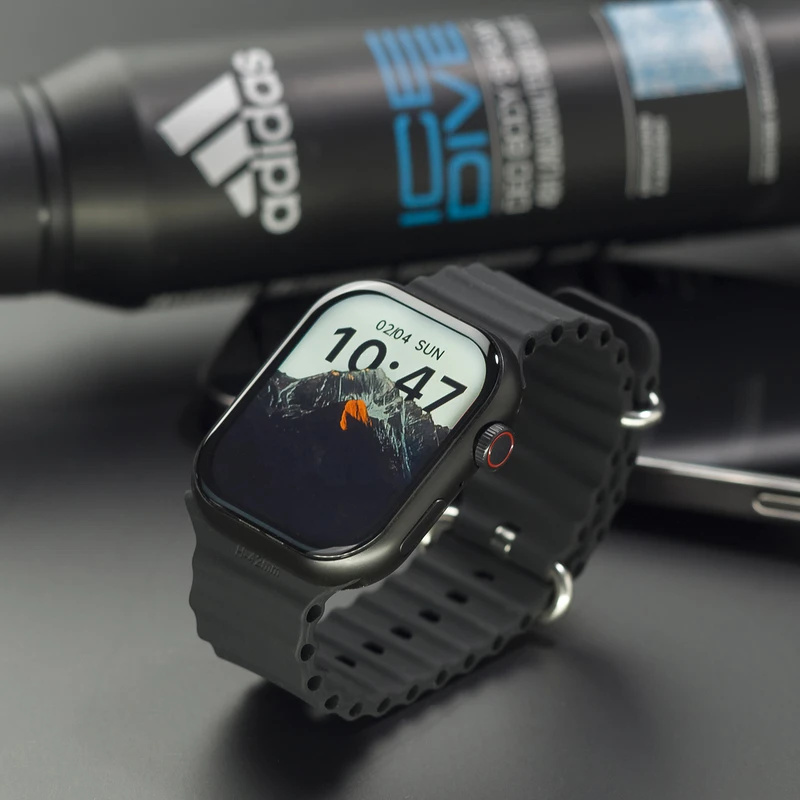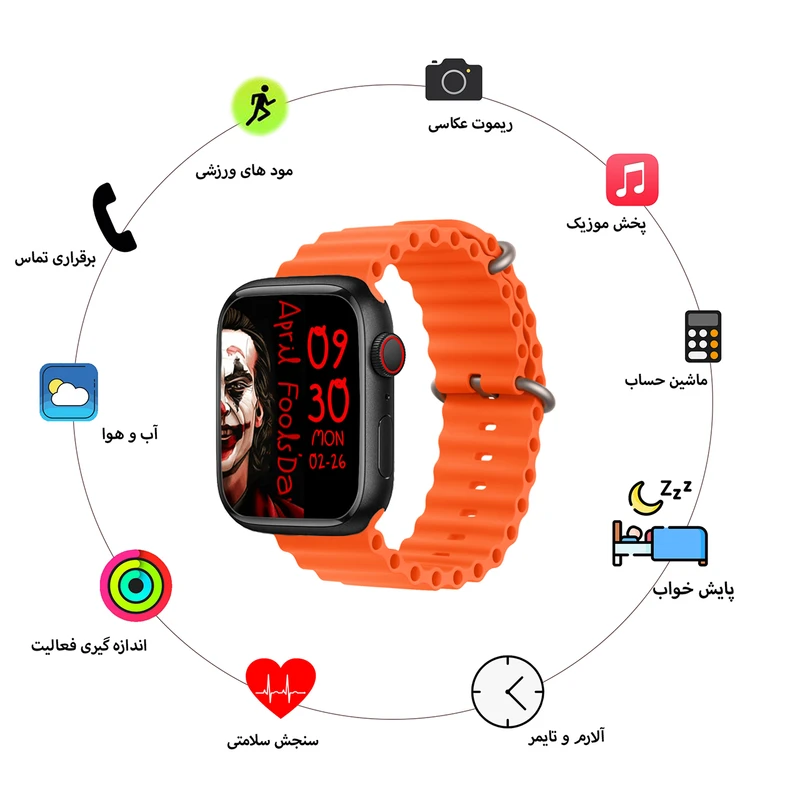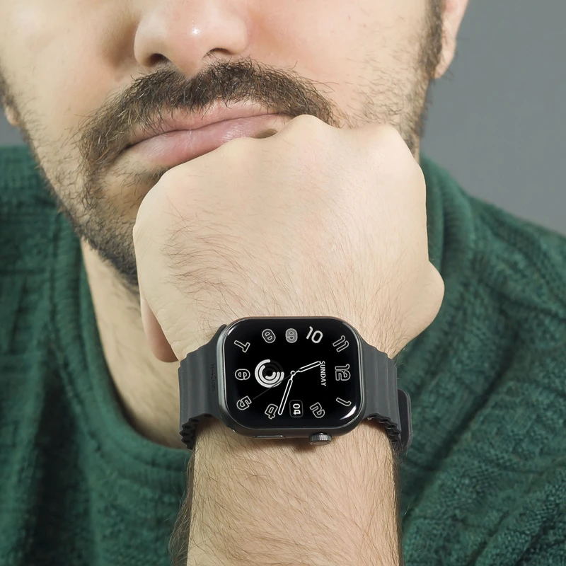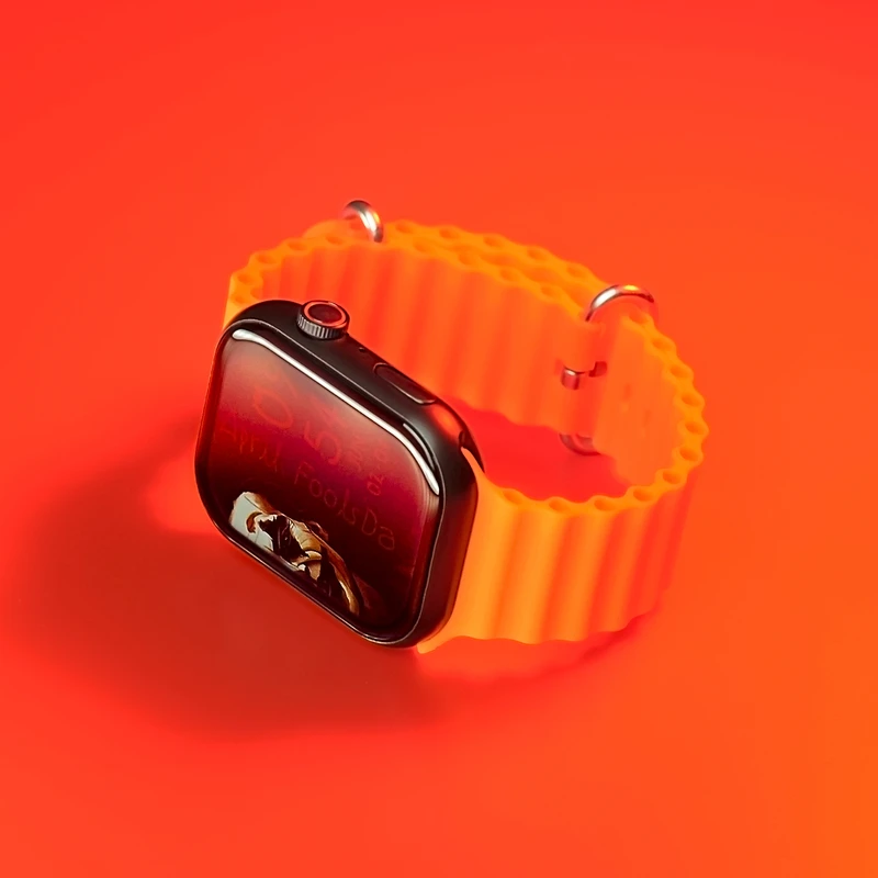 رنگ بدنه ساعت مشکی و به همراه سه عدد بند سیلیکونی اوشن با رنگ های مشکی-خاکستری-نارنجی