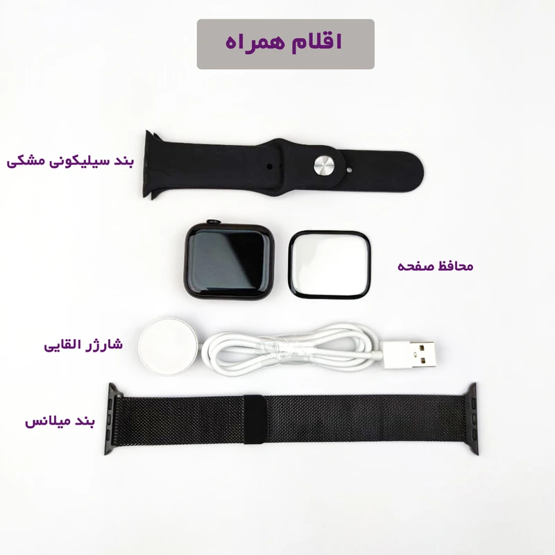 یک عدد بند سیلیکونی – یک عدد بند میلانس – یک عدد محافظ صفحه نمایش – شارژر ساعت هوشمند و راهنمای نصب نرم افزار به صورت فارسی