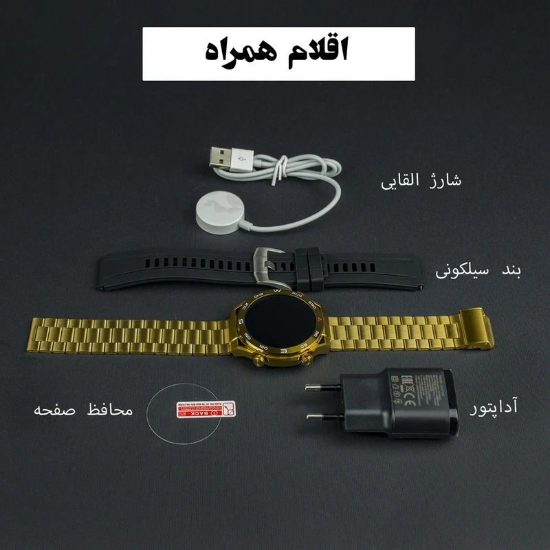 یک عدد بند سیلیکونی – یک عدد بند فلزی – آداپتور مخصوص ساعت هوشمند – محافظ صفحه نمایش – شارژر ساعت هوشمند و راهنمای نصب نرم افزار به صورت فارسی