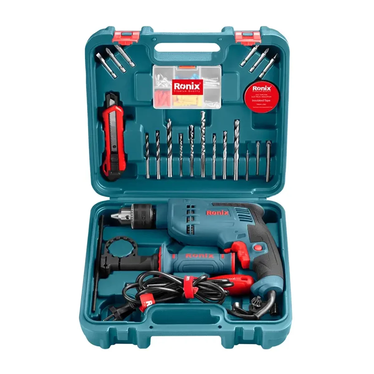 دسته جانبی، آچار سه نظام، عمق سنج، مته پیچشیHSS 5/6/8mm، مته سنگیmm 5/6/8، مته چوبmm 5/6/8، مته شیشهmm 5/6/8، مته شیشهmm 5/6/8، کاتر ABS، رابط mm PP 6.5، چسب برق 18mm*8m، مته CR.V SL4/ CR.V SL6/ CR.VPH1/ CR.VPH2/ CR.VPZ1/ CRV 50mm، سوکت 1/4 اینچmm 9/10/11/12، جعبه پیچ و رول پلاک 110mm*74mm*23mm، ده عدد رول پلاک 5/6/8mm، 10 عدد پیچ 5*25/4*20/3*16