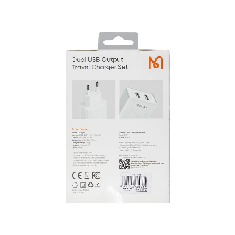 شارژر دیواری مک دودو مدل CH-3971 توان 12 وات به همراه کابل MicroUSB