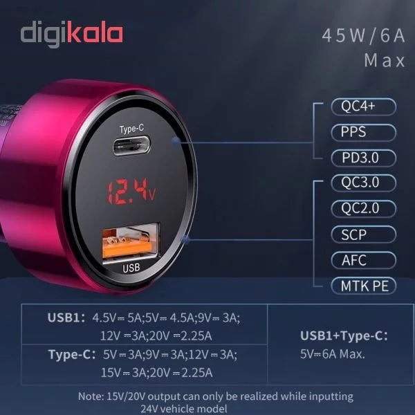 برند: Baseus مدل: C20C Magic Series PPS Digital Display ولتاژ ورودی: 12-24 ولت ولتاژ خروجی: 5 ولت قابلیت شارژ سریع: بله مناسب برای: انواع گوشی موبایل، تبلت و سایر دستگاه ها تعداد درگاه خروجی: ۲ عدد حداکثر توان خروجی: 45 وات درگاههای خروجی: USB/ Type-C نمایشگر ولتاژ: بله جنس بدنه: فلز ابعاد: 60.5x30.5 میلیمتر وزن: 45 گرم سایر مشخصات: خروجی USB : 4.5V/5A ,5V/4.5A , 9V/3A ,12V/3A , 20V/2.25A خروجی Type-C : 5V/3A ,9V/3A ,12V/3A , 15V/3A , 20V/2.25A مجموع خروجی : 5V/6A