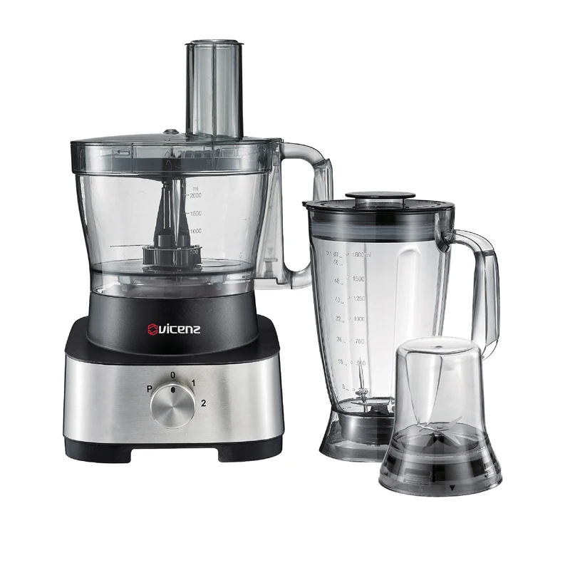 دارای تیغه های برش استيل برای قطعات ریز و درشت، دارای تیغه و کاردک ورز دهنده، دارای آبمرکبات گیر و همزن تخم مرغ، دارای پد لرزش گیر، قفل ایمنی، دارای آسیاب و مخلوط کن