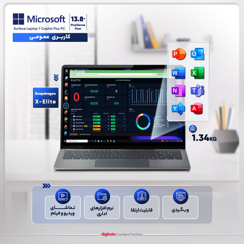لپتاپ مایکروسافت Surface Laptop 7 Copilot Plus PC با نمایشگر 13.8 اینچی، یکی از پیشرفتهترین دستگاههای نسل جدید است که تجربهای متفاوت از کاربری روزمره و حرفهای ارائه میدهد. بدنه تمامفلزی آلومینیومی با طراحی ظریف و وزنی تنها 1.34 کیلوگرم، حمل آن را در جلسات کاری، دانشگاه یا سفر بسیار آسان میسازد. این دستگاه علاوه بر زیبایی، دوام بالایی نیز دارد و به راحتی همراه همیشگی شما خواهد بود.