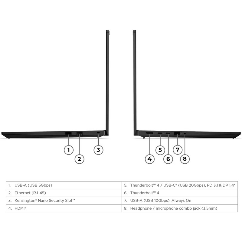 دو عدد USB-C (یک عدد Thunderbolt ۴ با سرعت 40 گیگابیت بر ثانیه و DisplayPort 2.1، یک عدد از نوع USB ۳.۲ Gen ۲ با سرعت 20 گیگابیت بر ثانیه و DisplayPort 1.4، هر دو با پشتیبانی از شارژ PD 3.1) / دو عدد USB-A (یکی از نوع Gen ۱ با سرعت 5 گیگابیت بر ثانیه و دیگری از نوع Gen ۲ با سرعت 10 گیگابیت بر ثانیه و قابلیت Always On)
