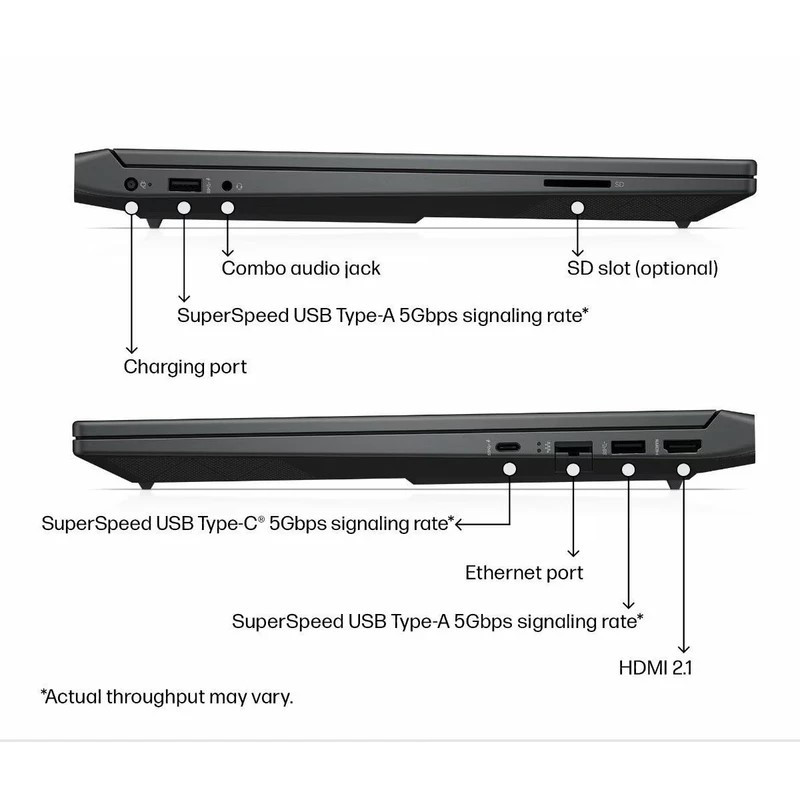 یک عدد USB-C (سرعت 5 گیگابیت بر ثانیه با پشتیبانی از DisplayPort 1.4 و تکنولوژی HP Sleep and Charge) / دو عدد USB-A (سرعت 5 گیگابیت بر ثانیه، یک درگاه با تکنولوژی HP Sleep and Charge)