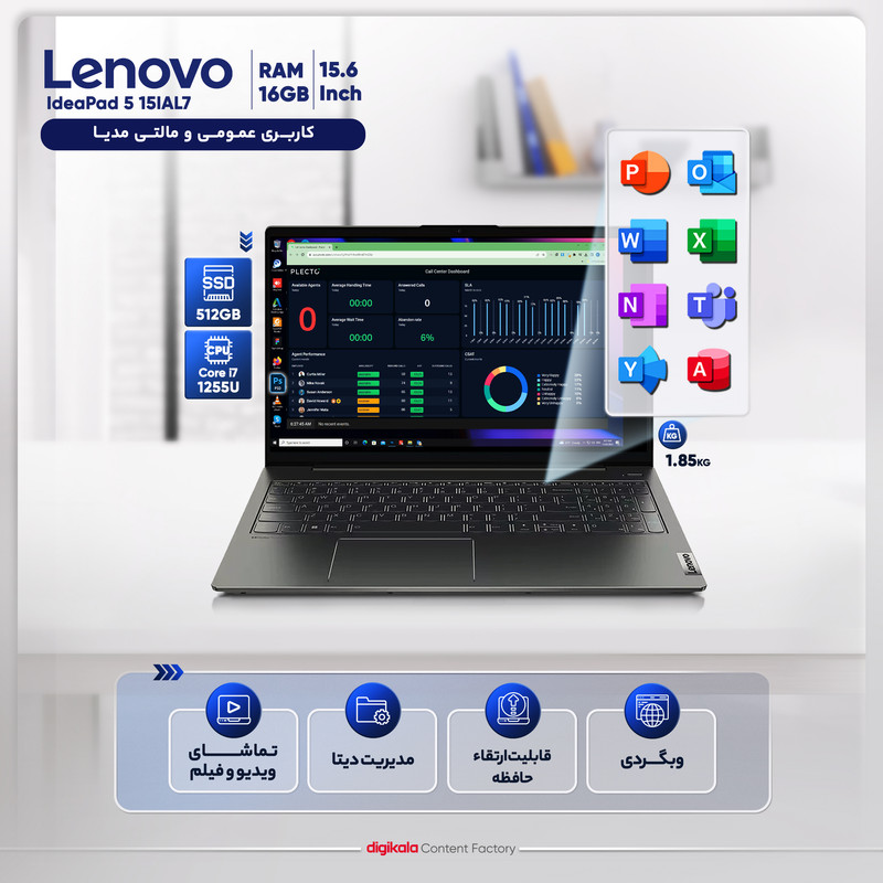 لپ تاپ مدل IdeaPad 5 15IAL7 لنوو، از جمله محصولات این شرکت است که به واسطه‌ی ویژگی‌های خود می‌تواند گزینه‌ای عالی برای انجام امور روزمره باشد. این لپ تاپ به پردازنده‌ی مرکزی Core i7 1255U شرکت اینتل مجهز شده است و این پردازنده با 10 هسته، 12 رشته، 12 مگابایت حافظه کش و فرکانس نهایی 4.7 گیگاهرتزی خود عملکردی قابل قبول در انجام پردازش‌های سنگین خواهد داشت. لازم به ذکر است که برای این لپ تاپ 16 گیگابایت رم از نوع DDR4 با سرعت 3200 مگاهرتز و 512 گیگابایت حافظه پر سرعت SSD در نظر گرفته شده است و در صورت نیاز می‌توان حافظه‌ی ذخیره‌سازی آن را ارتقا داد. شرکت لنوو برای این لپ تاپ از پردازنده‌ی گرافیکی GeForce MX550 با ظرفیت اختصاصی دو گیگابایت استفاده کرده است و از دیگر ویژگی‌های این لپ تاپ می‌توان به صفحه نمایش 15.6 اینچی با وضوح 1080p اشاره کرد.