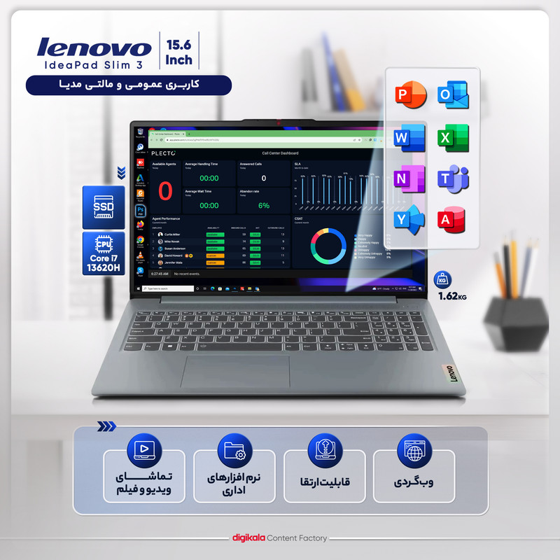 سری IdeaPad لپتاپهای لنوو طیف وسیعی از گزینههای مختلف با مشخصات سختافزاری و قیمت متنوع در اختیار کاربران قرار میدهد. لپتاپ IdeaPad Slim 3 15IRH8 یکی از گزینههای ایدهآل برای کاربری روزمره و عمومی و استفاده برای کار و تحصیل محسوب میشود. این لپتاپ 15.6 اینچی تنها 1.62 کیلوگرم وزن داشته و با ابعاد جمع و جور، یکی از بهترین گزینهها برای حمل و جابجایی خواهد بود. نمایشگر از پنل IPS با روزولوشون 1920 در 1080 یا همان Full HD استفاده میکند. نرخ بهروزرسانی 60 هرتزی و روشنایی 300 نیتی برای این رده کاربری کافی به نظر میرسد. برای پردازنده مرکزی، لنوو به سراغ یکی از گزینه های خوب نسل 13 اینتل یعنی Core i7 مدل 13620H رفته است. این پردازنده با وجود 10 هسته و 16 رشته پردازشی و حداکثر فرکانس 4.9 گیگاهرتزی، از پس تمام نیازهای کاربر برآمده و ارزش بالایی در برابر قیمت دارد. پردازنده گرافیکی مجزا برای این مدل در نظر گرفته نشده و پردازنده گرافیکی UHD به صورت مجتمع با پردازنده مرکزی وظایف این بخش را بر عهده دارد. 16 گیگابایت حافظه رم بهروز LPDDR5 مگاهرتزی میتواند در کنار پردازنده مرکزی قدرتمند، تجربه کاربری روان و بدون لگی برای کاربر فراهم کند. برای ذخیره اطلاعات هم حافظه SSD پرسرعت در نظر گرفته شده تا زمان بارگذاریها و انتقال فایلها نسبت به هاردهای سنتی کاهش قابل توجهی داشته باشد. باتری 3 سلولی با ظرفیت 47 وات ساعت و درگاههای متنوع و متعدد از دیگر ویژگیهای مهم IdeaPad Slim 3 15IRH8 هستند.