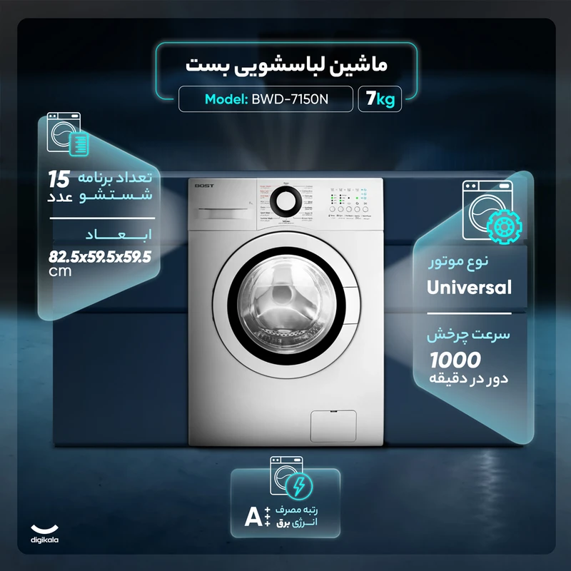 سیستم بخارشوی، پیش شستشو، شستشوی سریع 19 دقیقه ای، برنامه شستشو ( نخ پنبه ای، پشمی، کاموایی، حریر و ظریف، الیاف مصنوعی، لباس های ورزشی، انواع لباس ها، پیراهن و تیشرت، لباس های کودک)، آبکشی شرعی