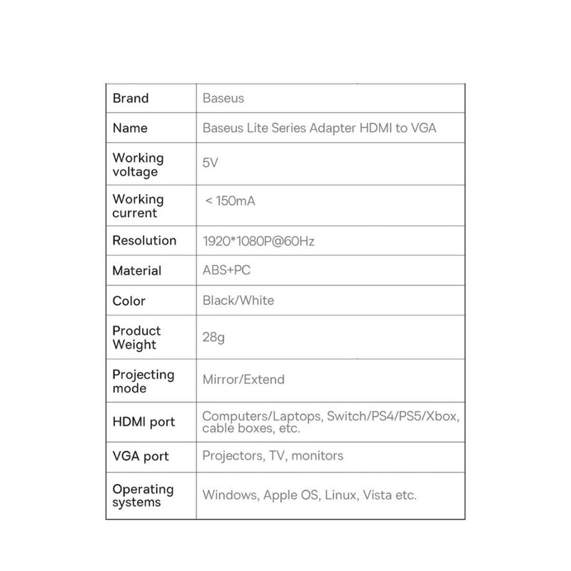 مبدل HDMI به VGA باسئوس مدل BS-OH010 یک آداپتور HDMI به VGA است که به شما امکان میدهد یک لپتاپ، کنسول یا پخش کننده رسانه جدید را به تلویزیون، مانیتور یا پروژکتور قدیمی متصل کنید. یک ابزار عالی که به شما امکان میدهد از جدیدترین تجهیزات تلفن همراه در گیرندههای قدیمی استفاده کنید. برای ارسال سیگنال با کیفیت از نوت بوک خود به آن، نیازی به خرید آخرین مدل تلویزیون ندارید.