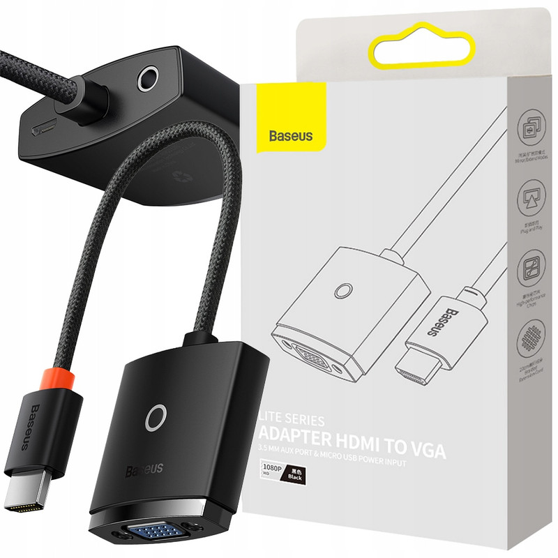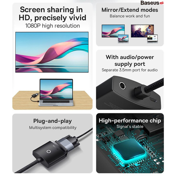 دارای کابلی به طول 20 سانتیمتر, حالت پروجکشن: Mirror/Extend, رزولوشن: 1920x1080P@60Hz, رابط ورودی: HDMI و Micro USB, رابط خروجی : VGA و درگاه صدای 3.5mm