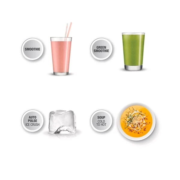 5 تنظیم سرعت و 3 دکمه از پیش تنظیم شده برای اسموتی ها، اسموتی های سبز و خرد کردن یخ، صفحه نمایش LCD سرعت و تنظیمات از پیش برنامه ریزی شده برای کنترل کامل را هنگام ترکیب نمایش می دهد.