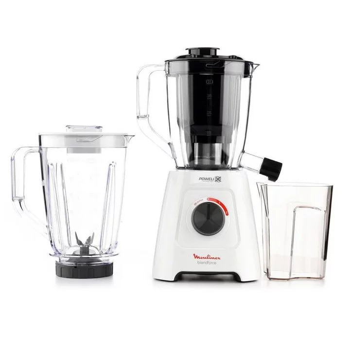 مخلوط کن دو منظوره مولینکس که علاوه بر مخلوط کن قابلیت آبگیری میوه هایی مانند سیب، هویج، سبزبجات، کیوی، هلو، توت فرنگی و … را داراست، موتور با توان 600 وات، پارچ از جنس پلی کربنات سبک و مقاوم، گنجایش 2 لیتر، تیغه های پارچ مخلوط کن از جنس فولاد ضد زنگ با شش پره که براحتی میتوانید یخ، انواع ککتل ها و اسموتی ها را تهیه کنید، دارای دو سرعت قابل تنظیم بهمراه حالت پالس، طراحی و مهندسی در کشور فرانسه مونتاژ نهایی در کشور چین، تیغه های مخلوط کن از سری POWELI technology میباشد که تا 30 درصد سریع تر مواد را میکس میکند،
