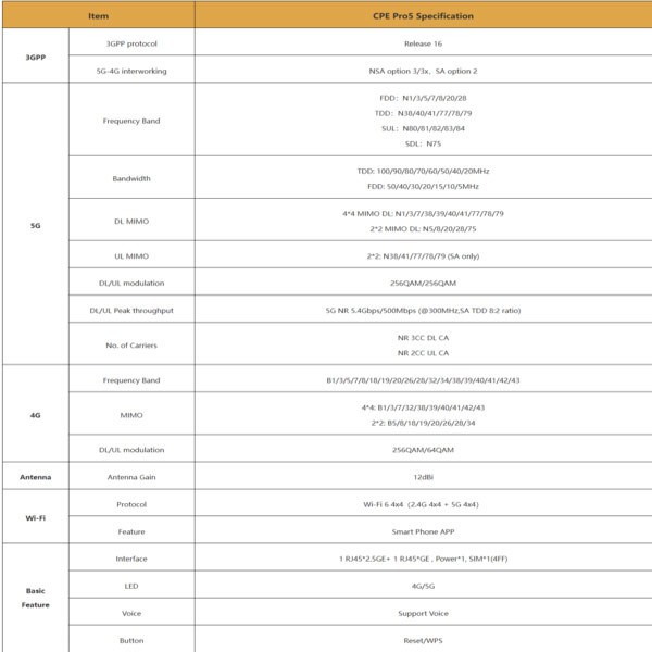 هنای باند فرکانس‌های مختلف در این مودم را نیز می‌توانید مشاهده کنید: TDD: ۱۰۰/۹۰/۸۰/۷۰/۶۰/۵۰/۴۰/20MHz FDD: 50/۴۰/۳۰/۲۰/۱۵/۱۰/5MHz باندهای این مودم در 4G اما به شرح زیر است: TDD& FDD : B1/3/5/7/8/18/19/20/26/28/32/34/38/39/40/41/42/43 در 4G نیز قابلیت تجمیع فرکانس و MIMO فراهم در باندهای زیر فراهم است: ۴*۴: B1/3/7/32/38/39/40/41/42/43 ۲*۲: B5/8/18/19/20/26/28/34