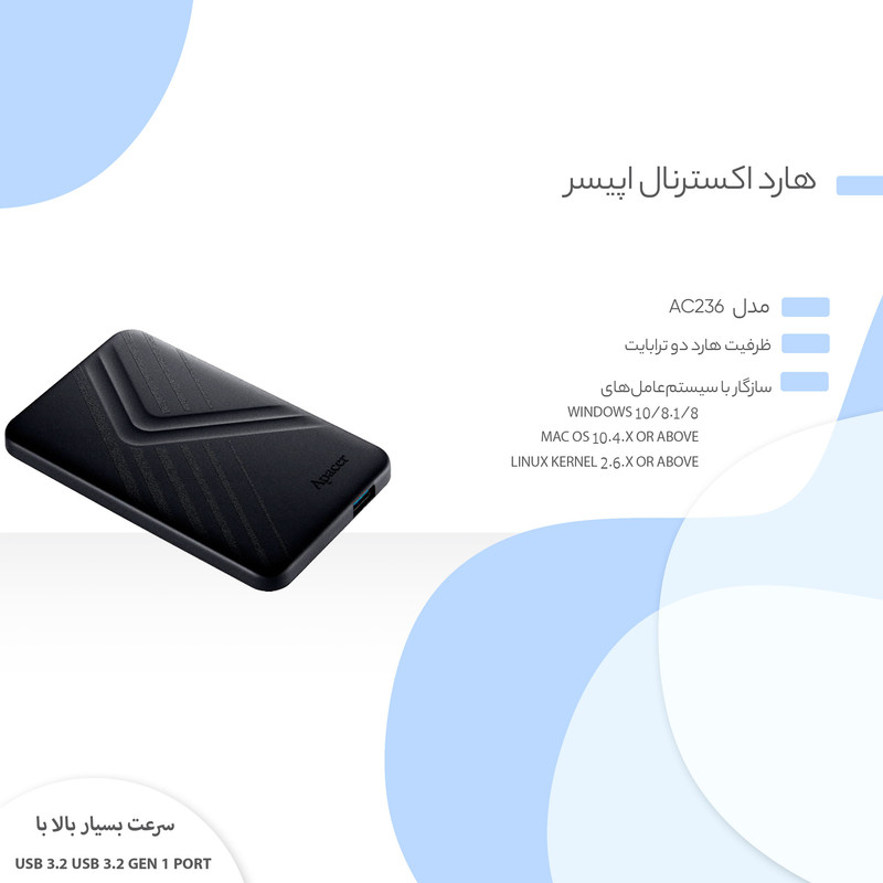 شرکت «اپیسر» محصولی را با نام هارد اکسترنال اپیسر مدل AC236 ظرفیت 2 ترابایت روانه بازار کرده است. این محصول یک هارد اکسترنال حرفه‌ای برای ذخیره‌سازی اطلاعات با سرعت زیاد است. هارد اکسترنال AC236 از طریق درگاه USB3.2 به کامپیوتر متصل می‌شود. درگاه USB3.2 ارائه‌شده روی این محصول از نوع A است و از آن می‌توان روی کامپیوترهایی با درگاه USB2.0 و USB3.0 هم بهره برد. طراحی این محصول به‌گونه‌ای است که می‌توان کابل اتصال را روی بدنه‌ هارد نصب کرد تا نگرانی بابت گم‌شدن آن وجود نداشته باشد و از طرفی فضای بسیار کمی را اشغال کند. ویژگی‌ای که این هارد اکسترنال را بسیار محبوب کرده وزن و ابعاد آن است که حمل‌ونقل و جابجایی را بسیار ساده کرده است. شرکت اپیسر از برندهای بزرگ تولیدکننده‌ تجهیزات کامپیوتری است که همواره محصولاتی باکیفیت را روانه‌ی بازار می‌کند.