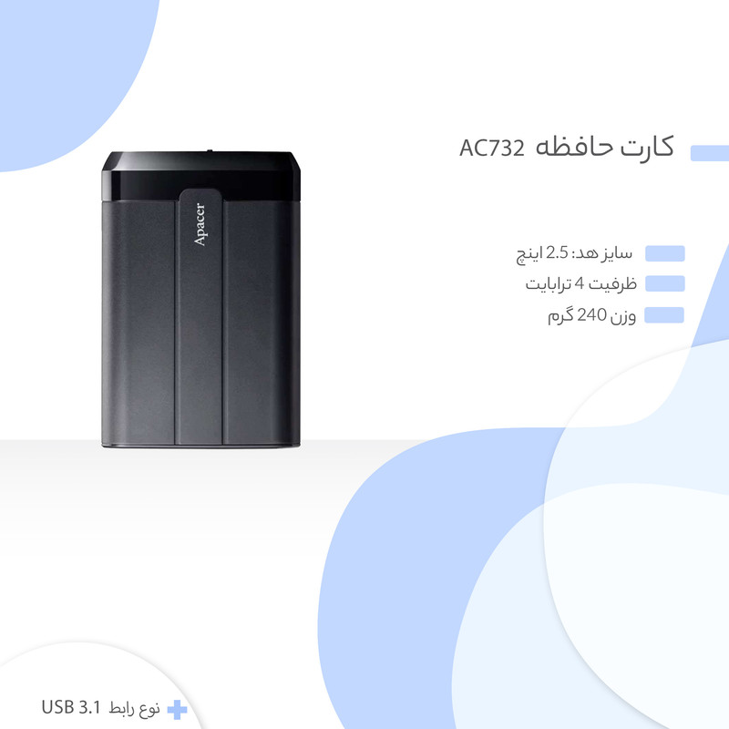 شرکت «اپیسر» محصولی را با نام «AC732» روانه بازار کرده است. این محصول یک هارد اکسترنال حرفه‌ای برای ذخیره‌سازی اطلاعات با سرعت زیاد است. هارد اکسترنال AC732 از طریق درگاه USB 3.1 به کامپیوتر متصل می‌شود. درگاه USB 3.1 ارائه‌شده روی این محصول از نوع A است و از آن می‌توان روی کامپیوترهایی با درگاه USB 2.0 و USB 3.0 هم بهره برد. طراحی این محصول به‌گونه‌ای است که می‌توان کابل اتصال را روی بدنه‌ی هارد نصب کرد تا نگرانی‌ای بابت گم‌شدن آن وجود نداشته باشد و از طرفی فضای بسیار کمی را اشغال کند. هارد اکسترنال AC732 در برابر آب مقاوم است؛ همچنین درصورتی‌که این هارد از فاصله‌ی 1.5 متری رها شود، آسیبی به اطلاعات موجود در آن وارد نمی‌شود. مقاومت بسیار خوب این محصول تا 4000 کیلوگرم باعث شده که‌ بتوانیم آن را جزو حرفه‌ای‌ترین هارددیسک‌های شرکت اپیسر نام ببریم. شرکت اپیسر از برندهای بزرگ تولیدکننده‌ی تجهیزات کامپیوتری است که همواره محصولاتی باکیفیت را روانه‌ی بازار می‌کند.