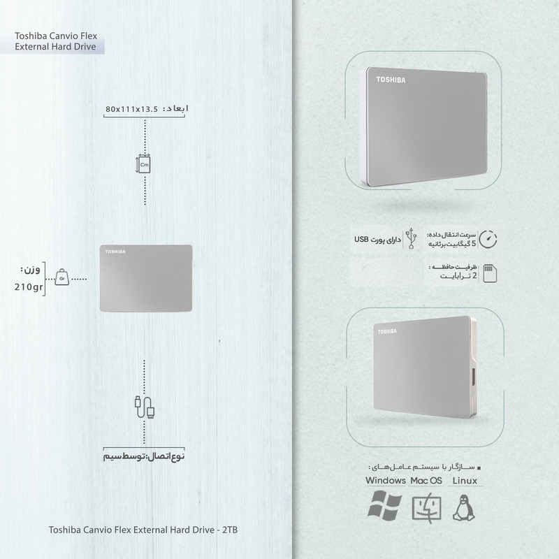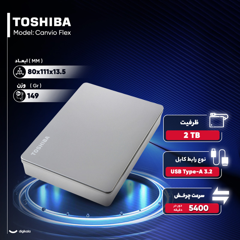 هارد اکسترنال توشیبا مدل Canvio Flex ظرفیت دو ترابایت دارای رابط USB Type-A 3.2