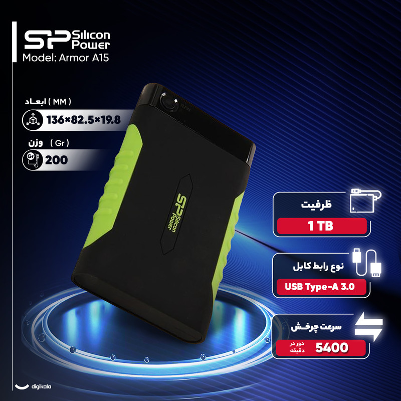 هارد اکسترنال سیلیکون پاور مدل Armor A15 ظرفیت 1 ترابایت دارای رابط USB Type-A