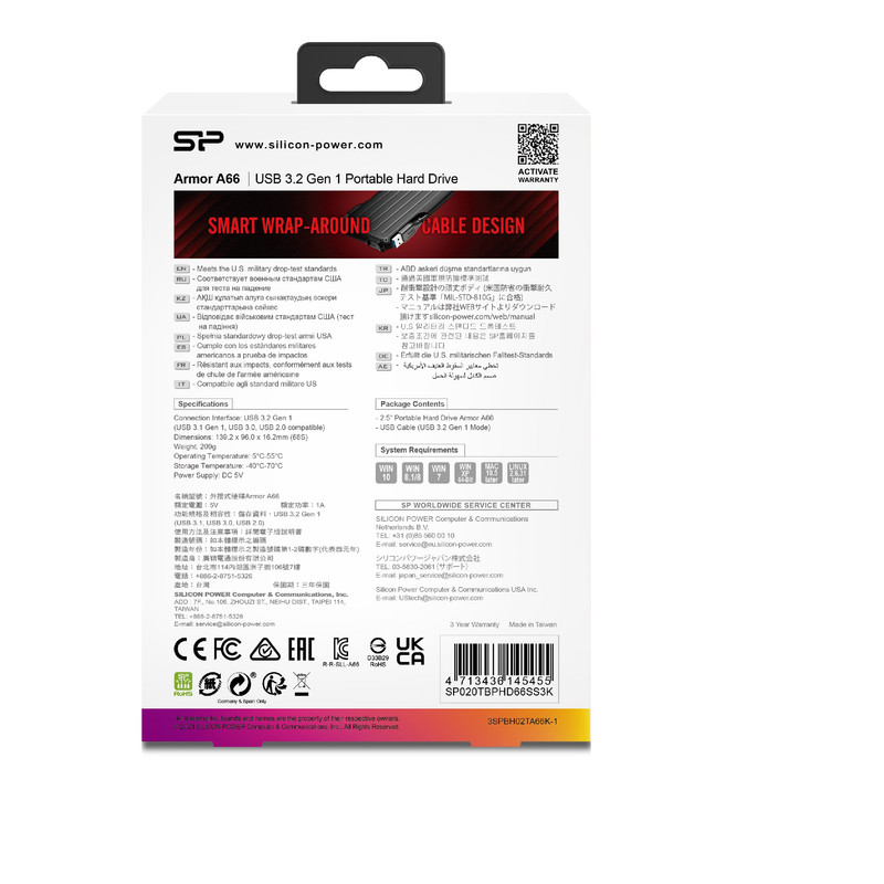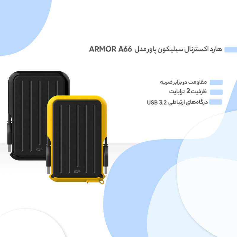 هارد اکسترنال «Armor A66» محصولی از شرکت «سیلیکون پاور» است که از ظرفیت یک تاپنج ترابایت برای ذخیرهسازی اطلاعات بهره میبرد. شرکت سیلیکون پاور هارد اکسترنال A66 را روانه بازار کرده است. هارد اکسترنال حاضر مدل Armor A66 بوده که ابعاد بسیار باریکتری دارد. این محصول شرکت سیلیکون پاور از بدنهای پلاستیکی و مقاوم در برابر انواع صدمات بهره میبرد. این بدنه به صورتی طراحی شده میتواند در برابر خط و خش مقاوم باشد. هارد اکسترنال Armor A66 از طریق رابط USB3.2 به کامپیوتر متصل میشود و میتواند اطلاعات را با سرعت زیاد انتقال دهد. این هارد در برابر پاشش آب، خط و خش و شوک مقاوم است. مقاومت هارد در برابر این صدمات باعث شده که خیال کاربر از به وجود آمدن مشکلات شایع در هاردهای اکسترنال آسوده باشد. کابل این محصول به بدنهی آن متصل است این هارد در رنگ های مشکی نوار مشکی – مشکی نوار زرد – مشکی نوار ابی تولید شده است