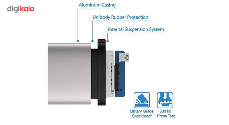 ضدضربه تا ارتفاع 122 سانتیمتر / ضدفشار تا میزان 500 کیلوگرم / ضدآب و ضد گردوغبار (دارای استاندارد IP68) / مجهز به سیستم تعلیق پیشرفته برای هارد دیسک داخلی / حفاظت از اطلاعات و رمزگذاری روی آنها با استفاده از برنامه SP HDD Lock / گواهی IP68 (مقاوم در برابر گرد و خاک و آب تا عمق بیش از 1 متر) / دمای عملیاتی هارددیسک: 5 درجه تا 55 درجه سانتیگراد / نرمافزار SP Widget / بدنه آلومینیومی / تاییدیههای CE, FCC, BSMI, Green dot, WEEE, RoHS, KCC, EAC, RCM