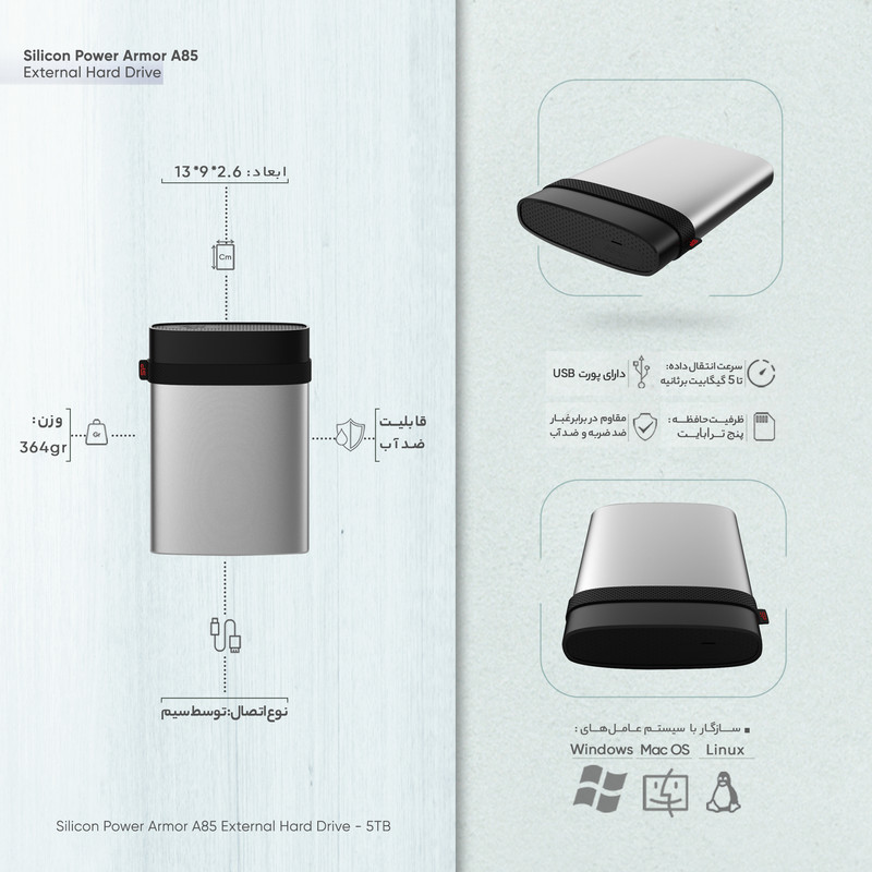 شرکت تایوانی «سیلیکونپاور» (Silicon Power) پس از تولید موفق چندین مدل از هارددیسکهای اکسترنال سری آرمور (Armor)، اینبار Armor A85 را عرضه کرده است. در بدنهی آرمور A85 از آلومینیوم استحکامیافته استفاده شده است که هم به زیبایی این محصول کمک میکند و هم مقاومت آن را کمی افزایش میدهد. البته آرمور A85 برای حفاظت از اطلاعات، کمتر به این پوشش آلومینیومی وابسته است و با سه لایهی محافظ، از هارددیسک داخلی مراقبت میکند. این سه لایه با ایجاد یک لایه بالشتکی، ضربههای وارده را جذب کرده و در جهت خنثیکردن آنها میکوشد. نقش این لایهها دقیقا مشابه سیستم تعلیق و فنربندی خودروست که با ایجاد لایهای فنری، مانع آسیبرسیدن به هارددیسک میشوند. به لطف این سازوکار محافظتی، آرمور A85 میتواند وزن 500کیلوگرمی را بهراحتی روی خود تحمل کند و آسیبی به آن وارد نشود.همچنین تا ارتفاع 122سانتی متری در برابر سقوط از ارتفاع مقاوم است. ضدضربه، ضدشوک و ضدآب بودن از دیگر ویژگیهای این محصول سیلیکونپاور است؛ بهاینترتیب آرمور A85 دارای گواهینامه IP68 هم است. شرکت سازندهی این هارددیسک برای امنیت اطلاعات کپیشده درون آن، نرمافزار رایگان SP HDD Lock را عرضه کرده است که به کمک آن میتوانید بهسادگی روی دادهها، رمز بگذارید تا کسی نتواند به اطلاعات شخصی شما دسترسی داشته باشد. برای وصلکردن این هارددیسکاکسترنال به کامپیوتر، رابط پرسرعت USB 3.0 در اختیار شماست که میتواند با سرعت زیادی اطلاعاتتان را جابهجا کند. البته از رابط USB 2.0 و نسخههای قبلتر از آن هم پشتیبانی میشود و نیازی نیست حتما یک کامپیوتر دارای پورت USB 3.0 داشته باشید. برای کابل رابط USB، یک نوار کشی پلاستکی، دور بدنهی این هارددیسک تعبیه شده است که تا حد زیادی از گمشدن احتمالی این کابل جلوگیری میکند. این هارداکسترنال در پنج ظرفیت و از 500 گیگابایت تا 5 ترابایت تولید شده است.این هارد 5 ترابایتی دارای ابعاد 26×92.3×132میلیمتر و وزن 364گرم است و با سیستم عاملهای ویندوز XP/Vista/7/8/10،مکینتاش 10.5 ولینوکس 2.6 سازگار است. آرمور A85 برای افرادی ساخته شده است که علاوهبر اهمیتدادن به زیبایی، به امنیت هم فکر میکنند و حاضرند برای آرامش خاطر خود، کمی بیشتر هزینه کنند.
