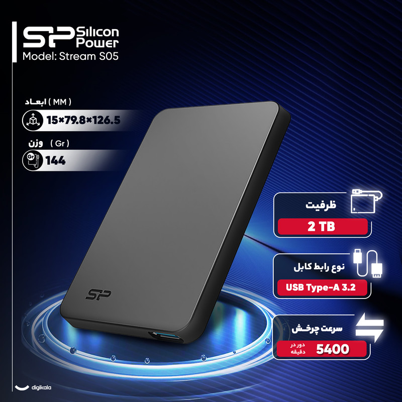 هارد اکسترنال سیلیکون پاور مدل Stream S05 ظرفیت ۲ ترابایت، گزینهای سبک و کمحجم برای کسانی است که به فضای ذخیرهسازی زیاد و جابجایی آسان نیاز دارند. این مدل با وزن ۱۴۴ گرم و ابعاد ۱۲۶.۵×۷۹.۸×۱۵ میلیمتر بهراحتی در کیف لپتاپ یا کیف دستی کوچک جا میگیرد. فرم فکتور ۲.۵ اینچی آن باعث میشود به منبع تغذیه جداگانه احتیاج نداشته باشد و انرژی از طریق پورت USB تأمین شود.