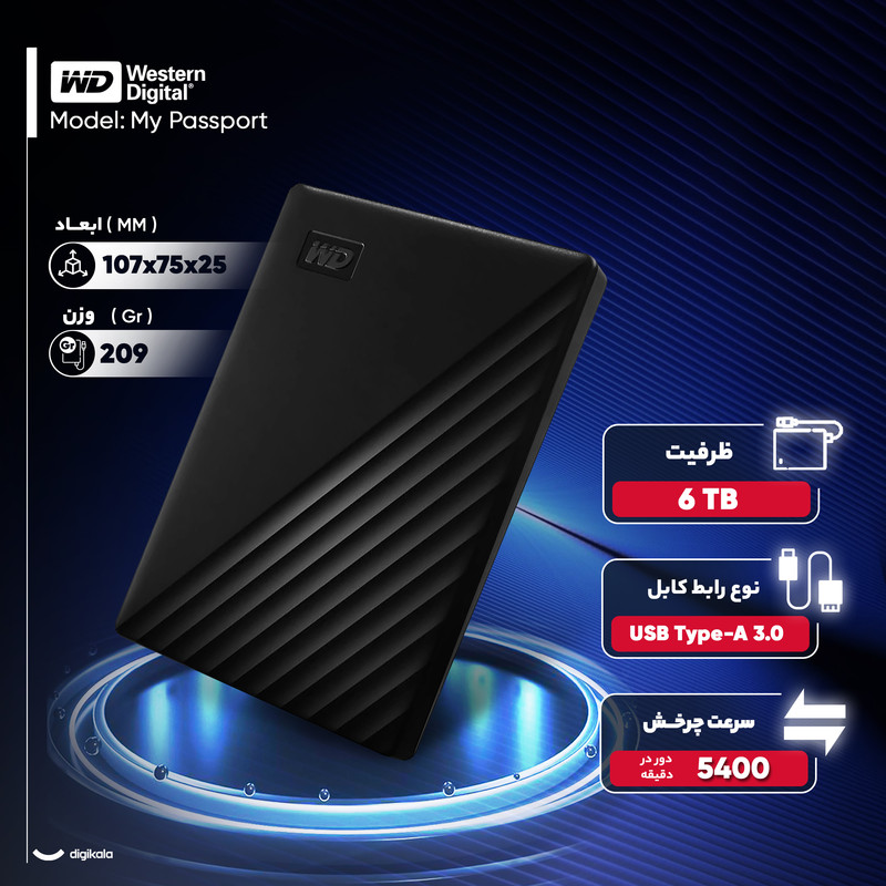 هارد اکسترنال وسترن دیجیتال مدل My Passport ظرفیت شش ترابایت دارای رابط USB Type-A 3.0
