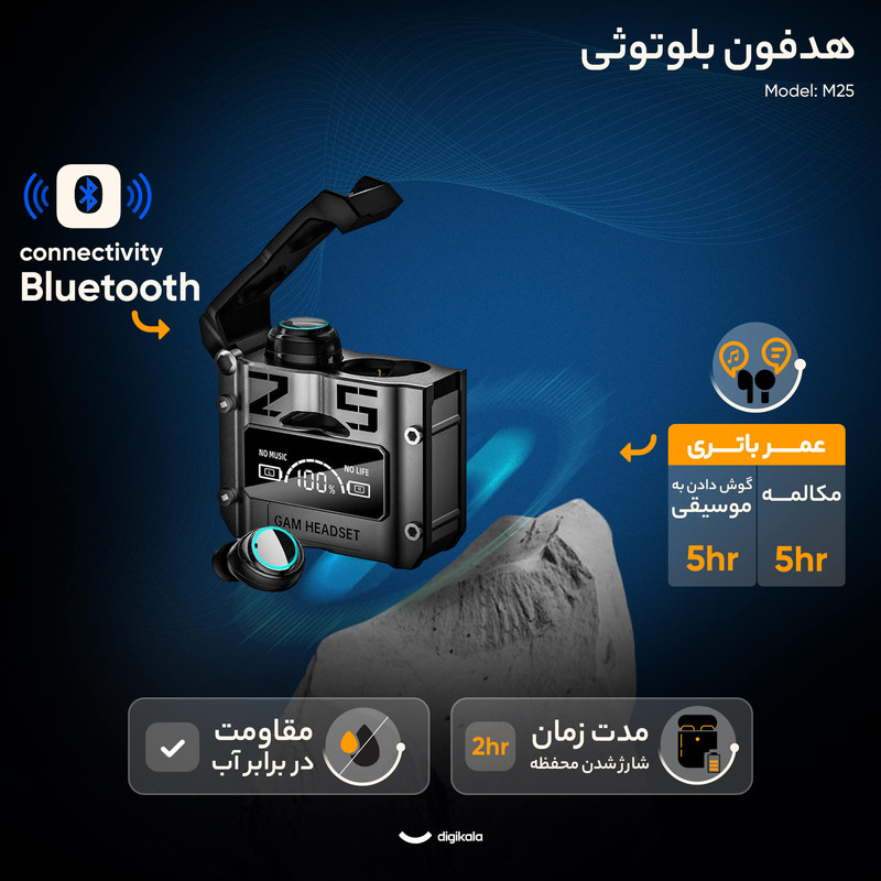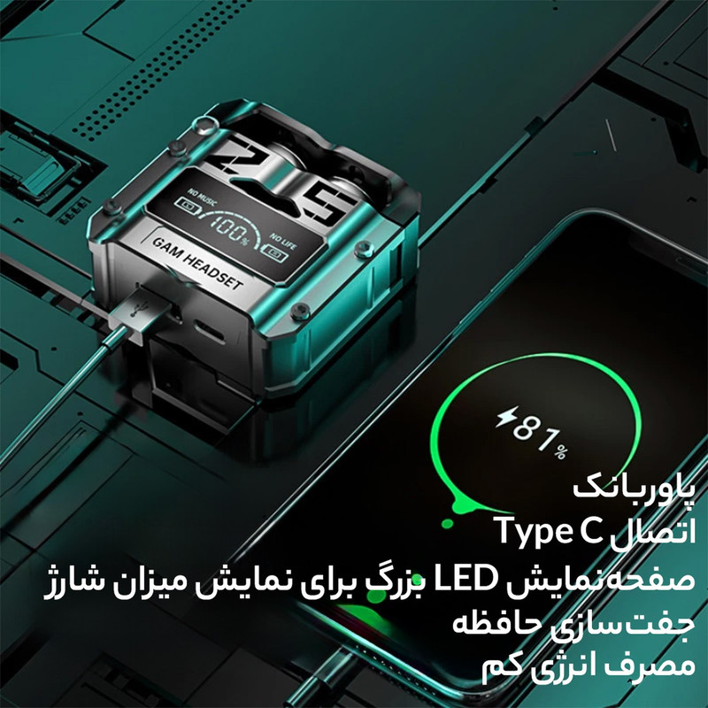 اگر به دنبال تهیه یک هدفون بیسیم گیمینگ و استفاده روزانه هستید ، هندزفری بلوتوثی گیمینگ DAMIX مدل M25 ENC یک ایرپاد مخصوص بازی و استفاده روزانه است که با طراحی اسپرت با افکت های لامپ های 7 رنگ RGB ظاهر جذاب برای استفاده روزانه را به شما اراِِئه می نماید. این مدل برای اتصال به دستگاه به بلوتوث نسخه 5.3 مجهز شده است و در مدت زمان کوتاه ، اتصال با گوشی موبایل اندروید یا ios شما برقرار خواهد شد.از ویژگیهای اصلی این محصول محفظه نگهدارنده یا همان کیس آن است. این کیس قابلیت شارژ هدفون را دارد. برای شارژ آن کافی است از درگاه USB-C تعبیه شده بر روی کیس و کابل شارژ درون بسته بندی استفاده کنید. همچنین این ایرپاد گیمینگ دارای یک میکروفون با کیفیت است و این ویژگی ، آن را برای مکالمه مناسب میسازد . از قابلیت های این محصول میتوان به ضد آب بودن ، فعال بودن Siry در آیفون ، HD Voice و ENC است. زیر این محصول یک پورت خروجی USB نیز قرار دارد که به وسیله آن میتوانید از باتری ایرپاد به عنوان پاور بانک اضطراری نیز استفاده کنید