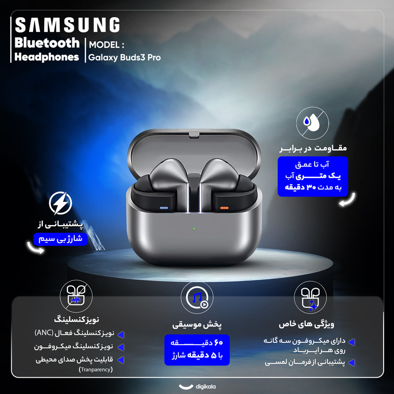 سامسونگ مدل Galaxy Buds3 Pro از فناوری حذف نویز فعال (ANC) بهره میبرد که به شما امکان میدهد در محیطهای پرسروصدا هم بهوضوح به موسیقی یا مکالمات خود گوش دهید. با فعالکردن این قابلیت، عمر باتری در حالت پخش موسیقی به 6 ساعت و در حالت مکالمه به 4.5 ساعت کاهش مییابد، اما در صورت خاموش بودن ANC، این زمانها به 7 ساعت و 5 ساعت افزایش مییابد. همچنین، با داشتن گواهی IP57، این هدفون مقاوم در برابر آب تا عمق یک متر به مدت 30 دقیقه است که آن را برای استفاده در شرایط مختلف مناسب میسازد.