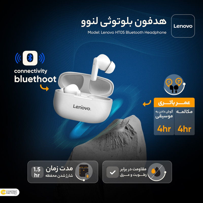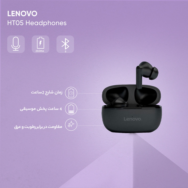 اگر به دنبال هدفون بلوتوثیای هستید که نیازهای عمومی شما را برطرف کند و بتوانید با آن ورزش کنید، مدل HT05 از برند لنوو مناسب شماست! هدفون بلوتوثی لنوو از یک طراحی زیبا و ویژه بهره میبرد که باعث شده گوشیها به خوبی داخل گوش فرو رفته و از داخل گوش نیفتند. این موضوع موجب شده که هدفون بلوتوثی لنوو برای ورزشکاران انتخابی مناسب باشد. مخصوصا که این محصول مقاومت بالایی در برابر رطوبت و تعریق دارد و ورزش کردن مشکلی برای سلامتی هندزفری به وجد نمیاورد. ظرفیت باتری هندزفری مدل HT05 برابر با 250 میلی امپر ساعت است و در حدود 6 ساعت شارژدهی دارد. استفاده از بلوتوث 5.0 برای اتصال کمک میکند که ارتباط بهتری بین هندزفری و دستگاه برقرار شود و اختلالی در اتصال به وجود نیاید. وزن سبک و بیس قوی موسیقیهای پخش شده هم از دیگر نقاط قوت هدفون بلوتوثی لنوو هستند.