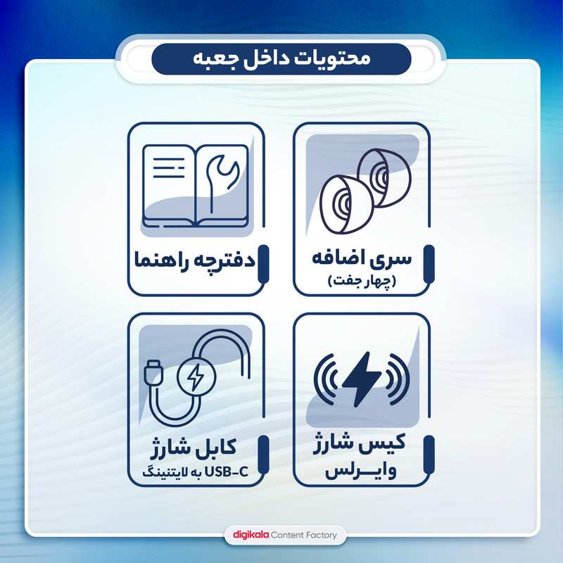 کیس شارژ (پاوربانک) با قابلیت شارژ بی سیم / چهار نوع گوشی سیلیکونی ضد حساسیت (سایز: بسیار کوچک(XS)، کوچک(S)، متوسط(M)، بزرگ(L)) / کابل USB-C به لایتنینگ / دفترچه راهنما