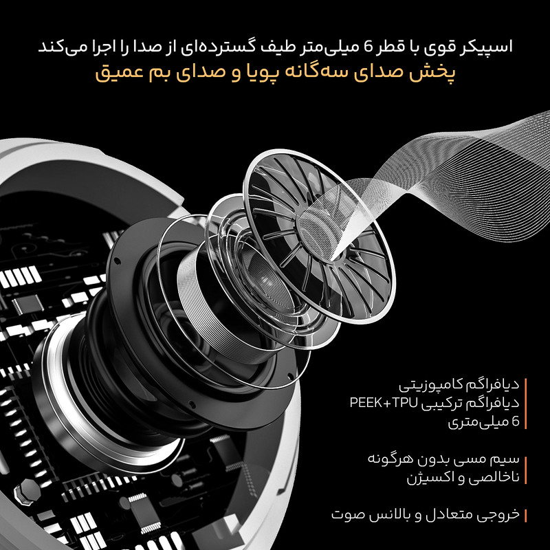 هدفون بی سیم RS70 دارای قابلیت سوئیچ MASTER-SLAVE است که با این قابلیت می توانید بطور جداگانه از هر گوشی بعنوان گوشی اصلی استفاده کنید. اسپیکر گوشی های این هندزفری دارای دیافراگم کامپوزیتی ترکیبی PEEK+TPU قطر 6 میلی متری و همچنین سیم های مسی بدون هرگونه ناخالصی و اکسیژن می باشد. بر همین اساس خروجی صدای گوشی ها نیز بسیار واضح، شفاف، متعادل و دارای بالانس بسیار مناسب و استاندارد است. و در نهایت طراحی انحنادار کویل و ساختار با کیفیت اجزای آکوستیک این هندزفری باعث می شود تا صدایی غنی و خالص را تجربه کنید.