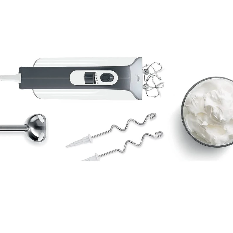 همزن بهمراه پایه گوشت کوب برقی استیل، موتور پرقدرت با توان 850 وات، دور موتور متغییر با 5 سرعت قابل تنظیم،دارای پایه گوشت کوب برقی از جنس استیل قابل استفاده در مواد غذایی گرم و ضد پاشش، دارای پره های همزن نرم و سفت جهت تهیه سفیده تخم مرغ، پخت کیک و شیرینی و ….، قطعات پلاستیکی عاری از هرگونه مواد شیمیایی (BPA FREE)، سیم برق تلفنی، لیوان میکس مدرج
