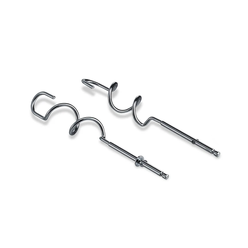 جنس تیغه همزن از استیل است و درون جعبه یک جفت سری برای همزدن خمیر نیز وجود دارد. این قطعه به شما کمک میکند تا بتوانید خمیر نان یا شیرینی را برای پخت آماده کنید. به روی بدنه دستگاه دکمهای تعبیه شده که با فشار دادن آن سری همزن جدا میشود و شما میتواند به راحتی آن را بشویید و یا با سری مخصوص زدن خمیر تعویض کنید.
